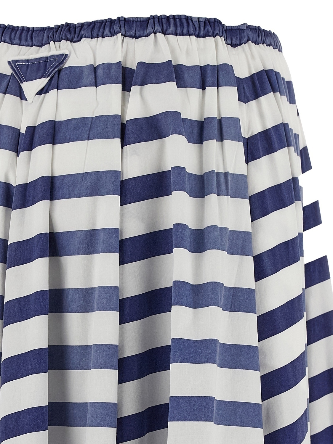 Миди-юбка из хлопкового поплина с выцветшим ретро-узором в полоску, тканый логотип-треугольник в тон на спинке, пышная юбка, регулируемый шнурок на талии, карманы.