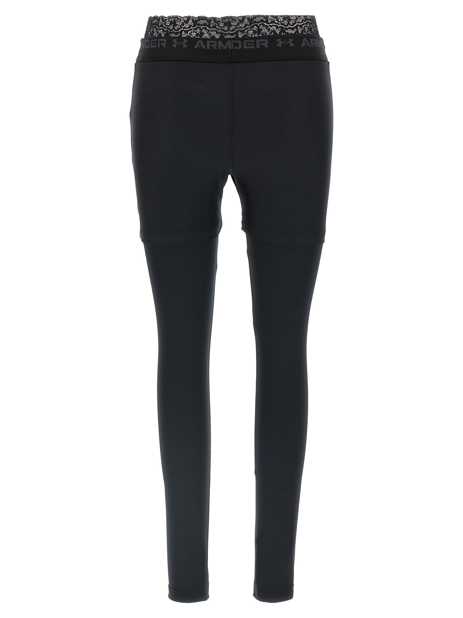 Леггинсы Under Armour из технической ткани с принтом логотипа спереди, эластичным поясом с логотипом и кружевной отделкой на талии.
