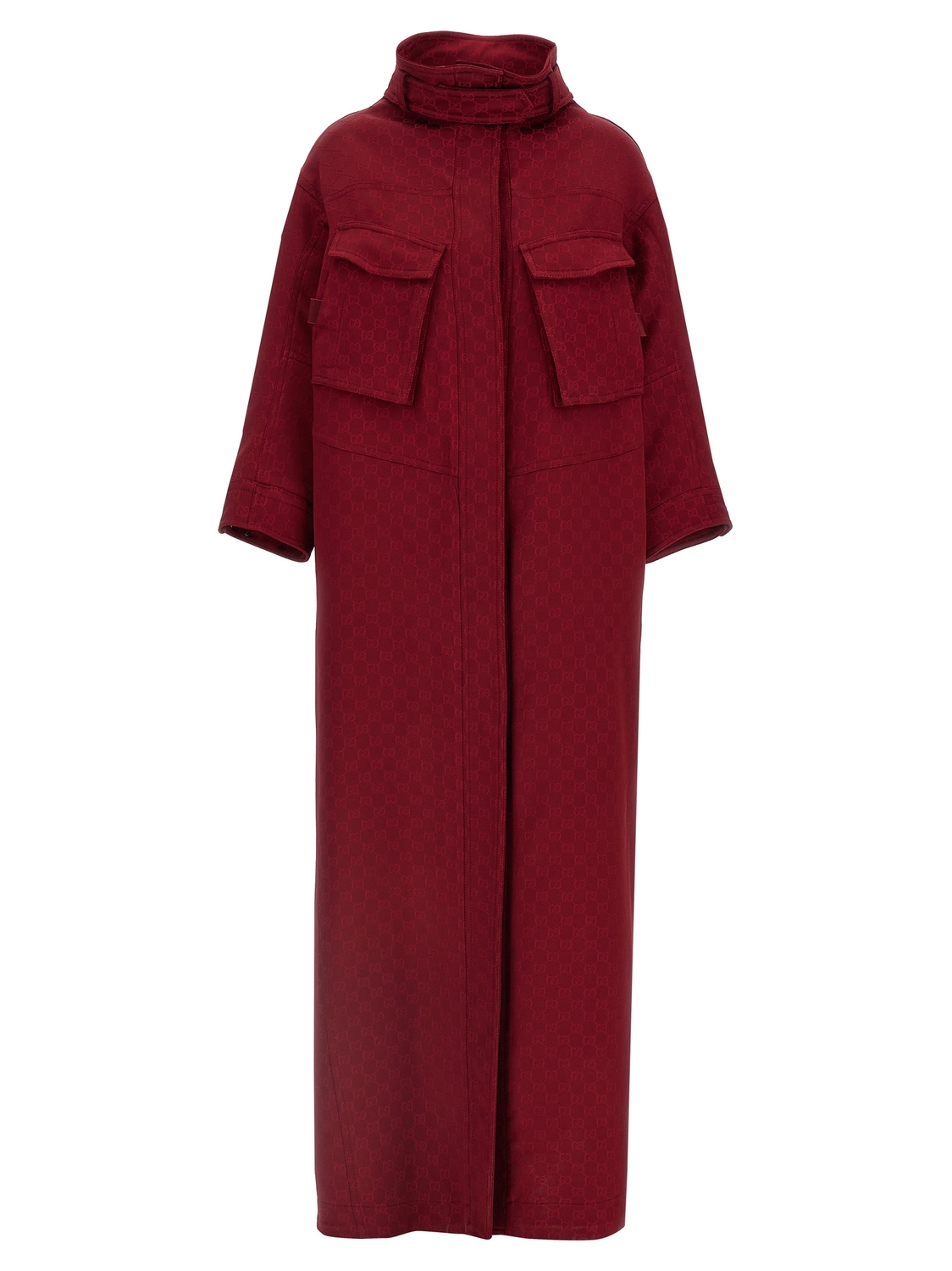 Длинное пальто из ткани GG жаккард 'Gucci Rosso Ancora', подкладка из вискозы, высокий воротник, застежка-молния и передние кнопки, кулиска на талии, длинные рукава с манжетами и заниженными плечами, разрез сзади.