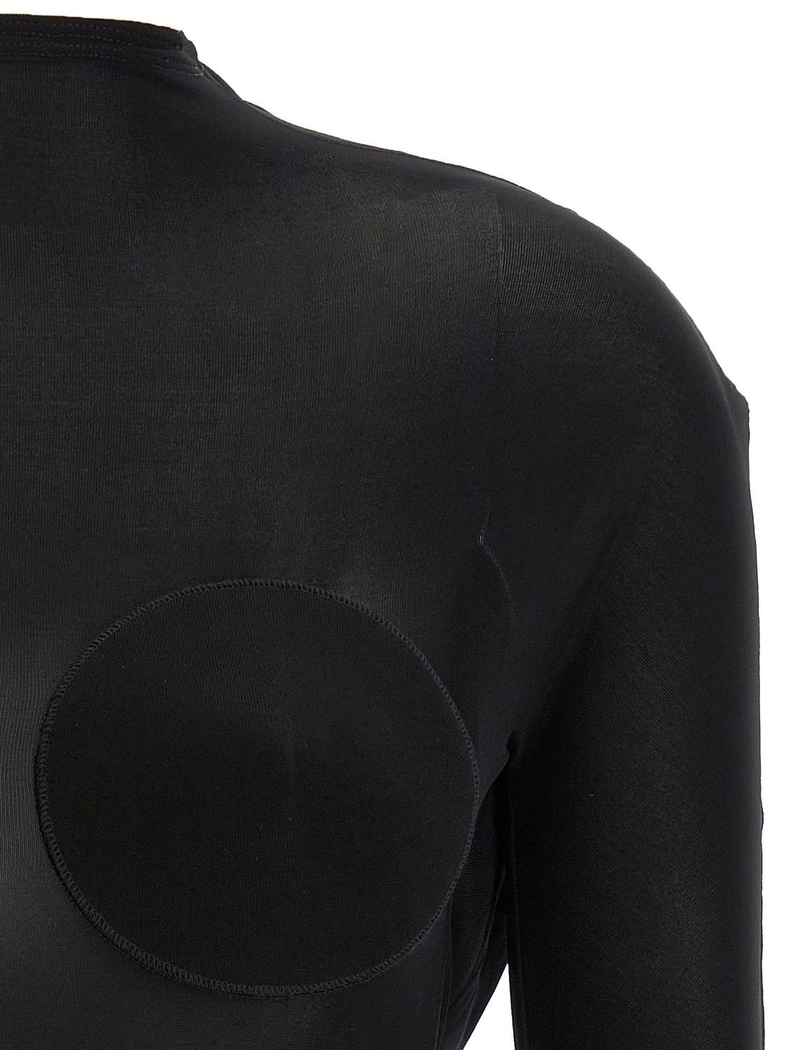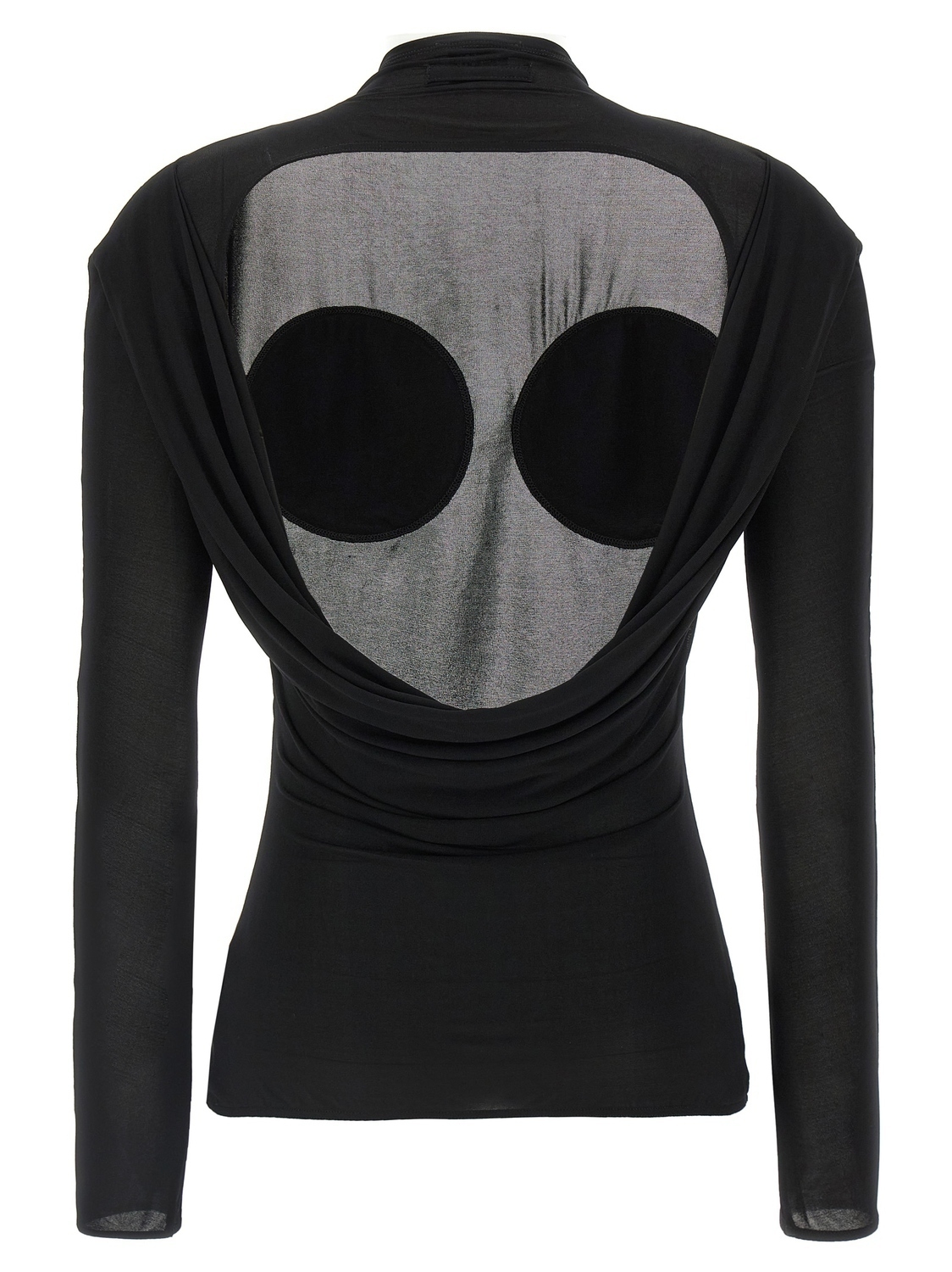 Полупрозрачный легкий джерси-свитер, объемная деталь в форме конуса спереди, вырез на спинке, длинные рукава.