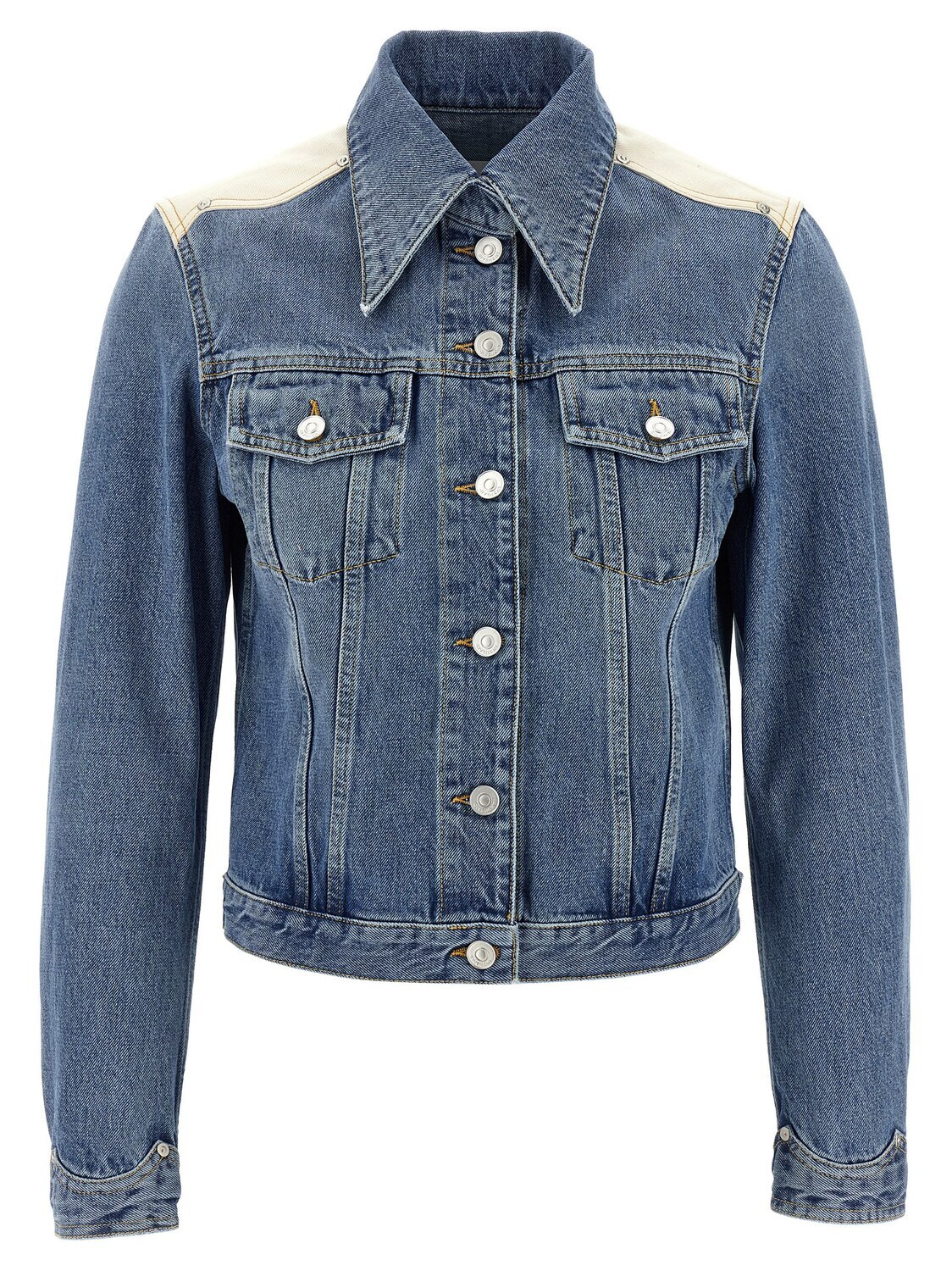 Джинсовая куртка из хлопка с верхней отделкой из канвы, застежкой на пуговицы спереди, карманами, длинными рукавами с манжетами.