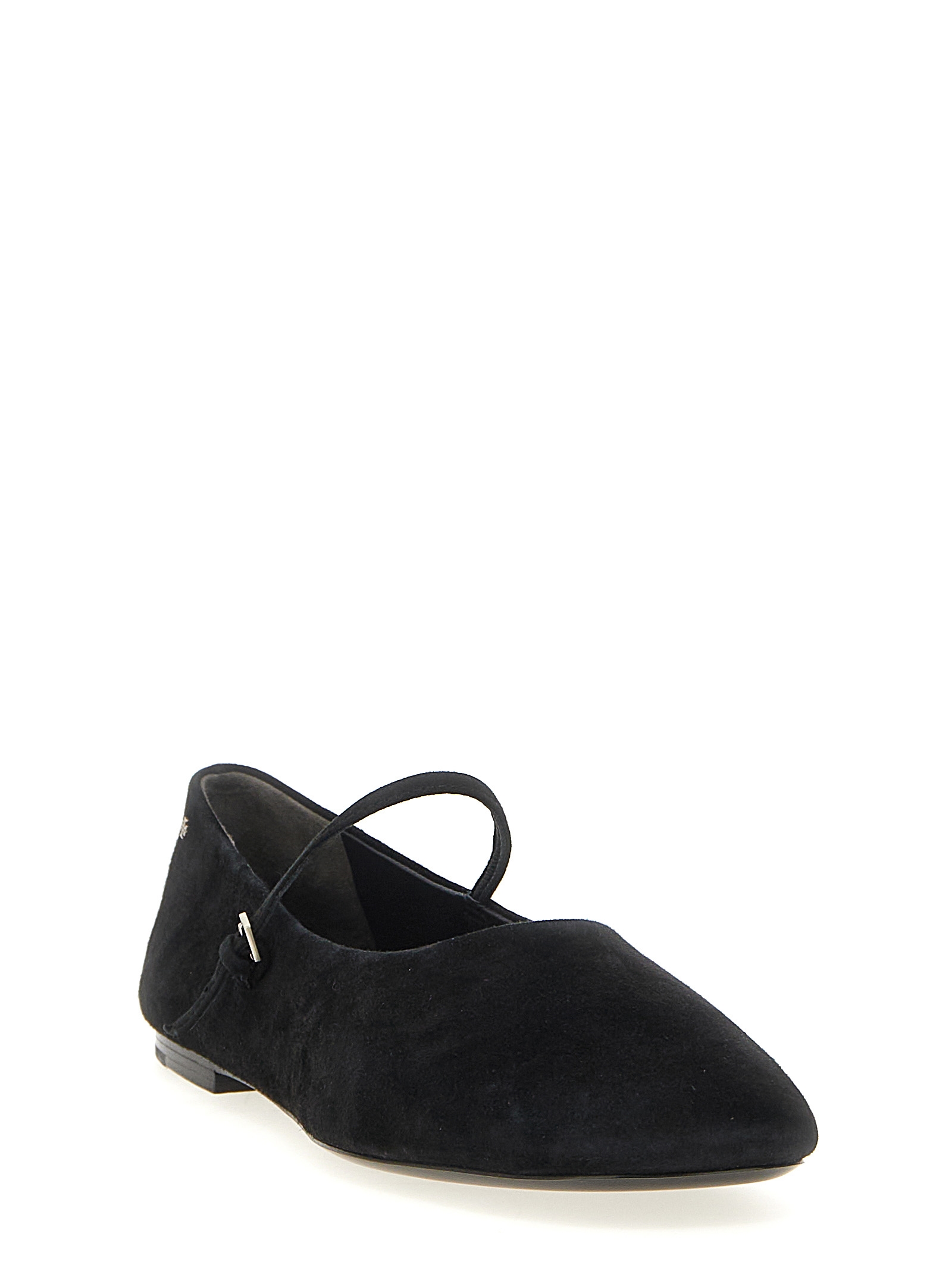 Балетки 'Mary Jane' из замши с регулируемым ремешком, металлическим логотипом и кожаной подошвой.