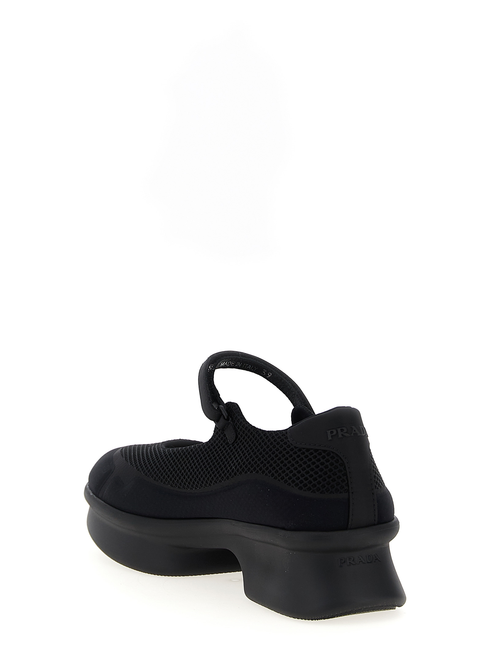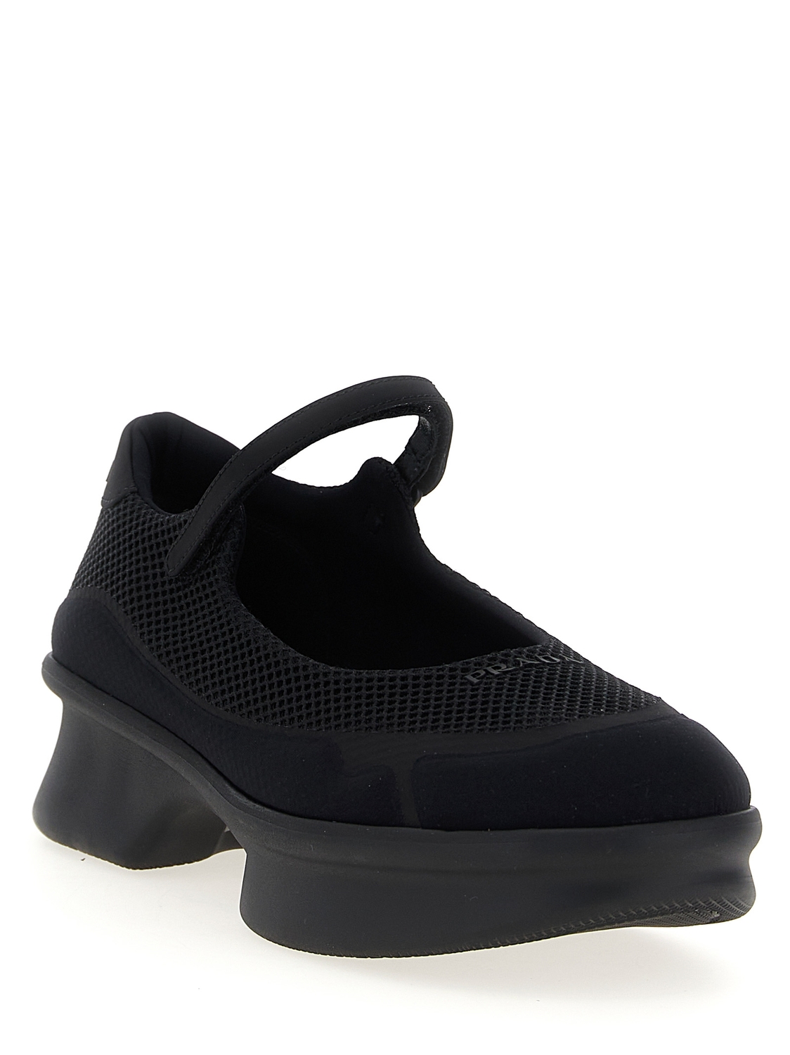 Балетки из ажурной сетки с тоном-в-тон надписью логотипа спереди и сзади, регулируемый ремешок на липучке, увеличенная резиновая подошва.