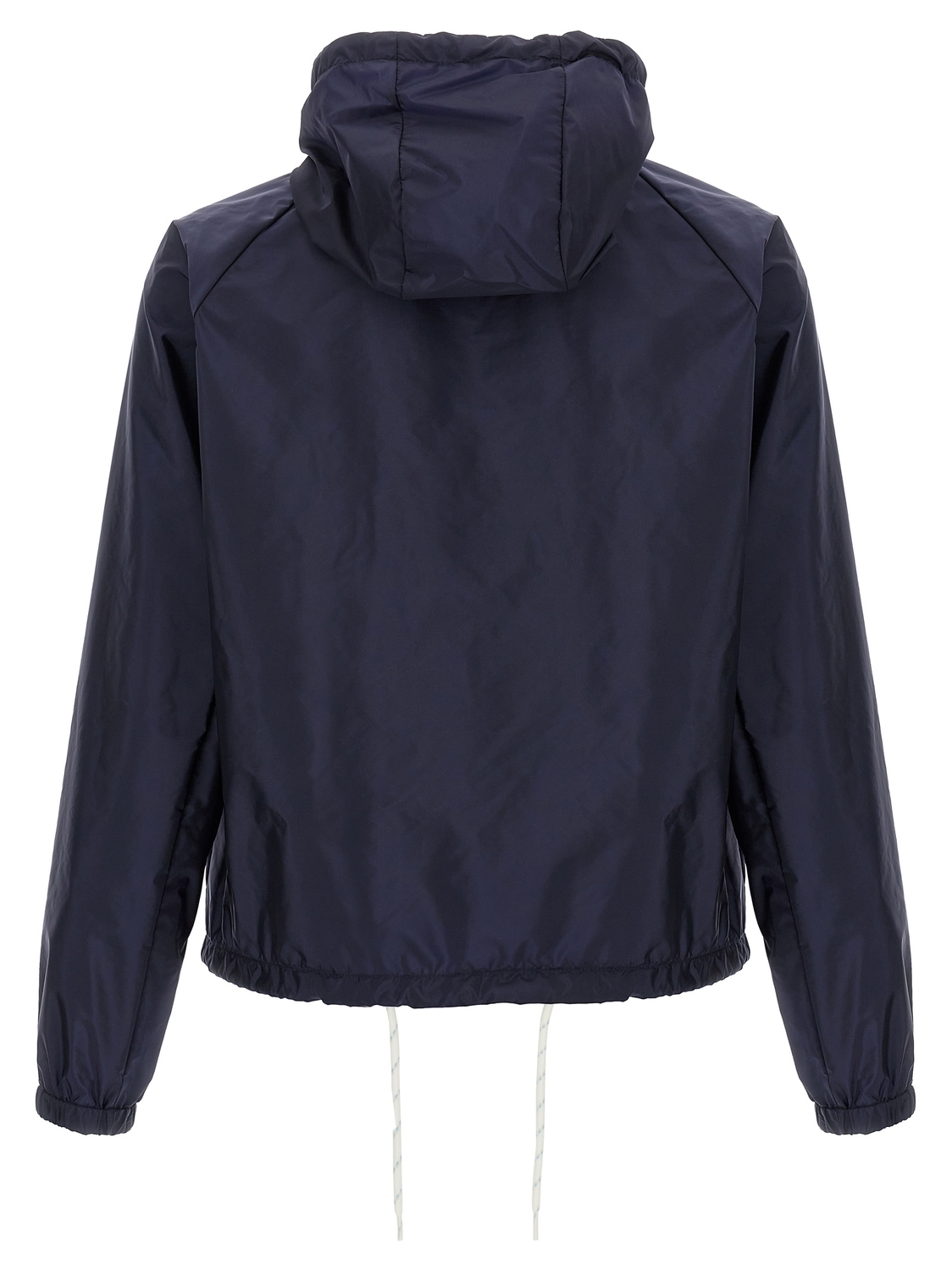 Подкладка блузона из Re-Nylon, треугольный логотип из эмалированного металла и застежка-молния спереди, капюшон со шнурком, карманы, длинные рукава с эластичными манжетами и заниженной линией плеча, шнурок на подоле.