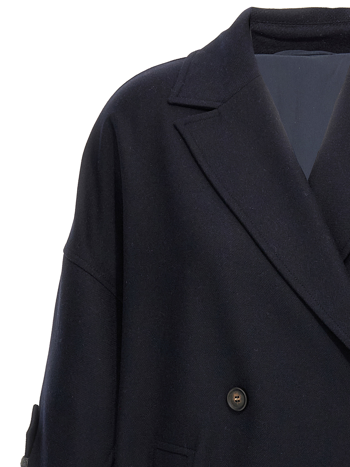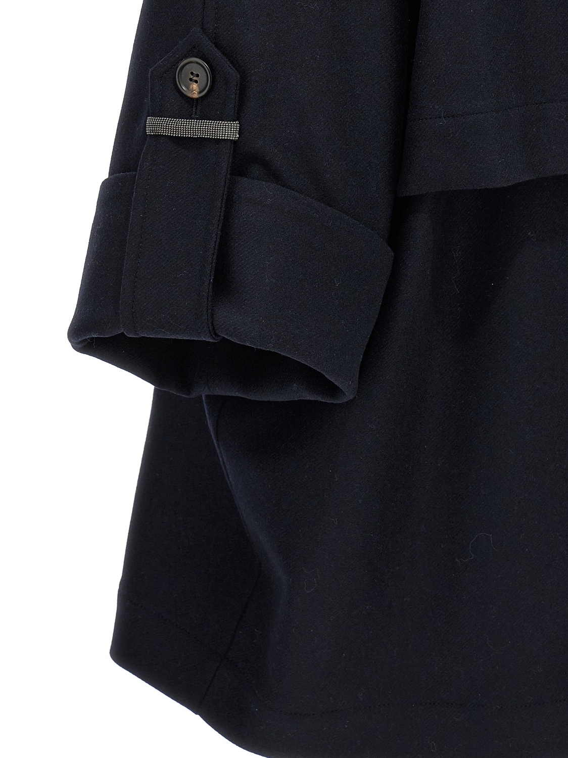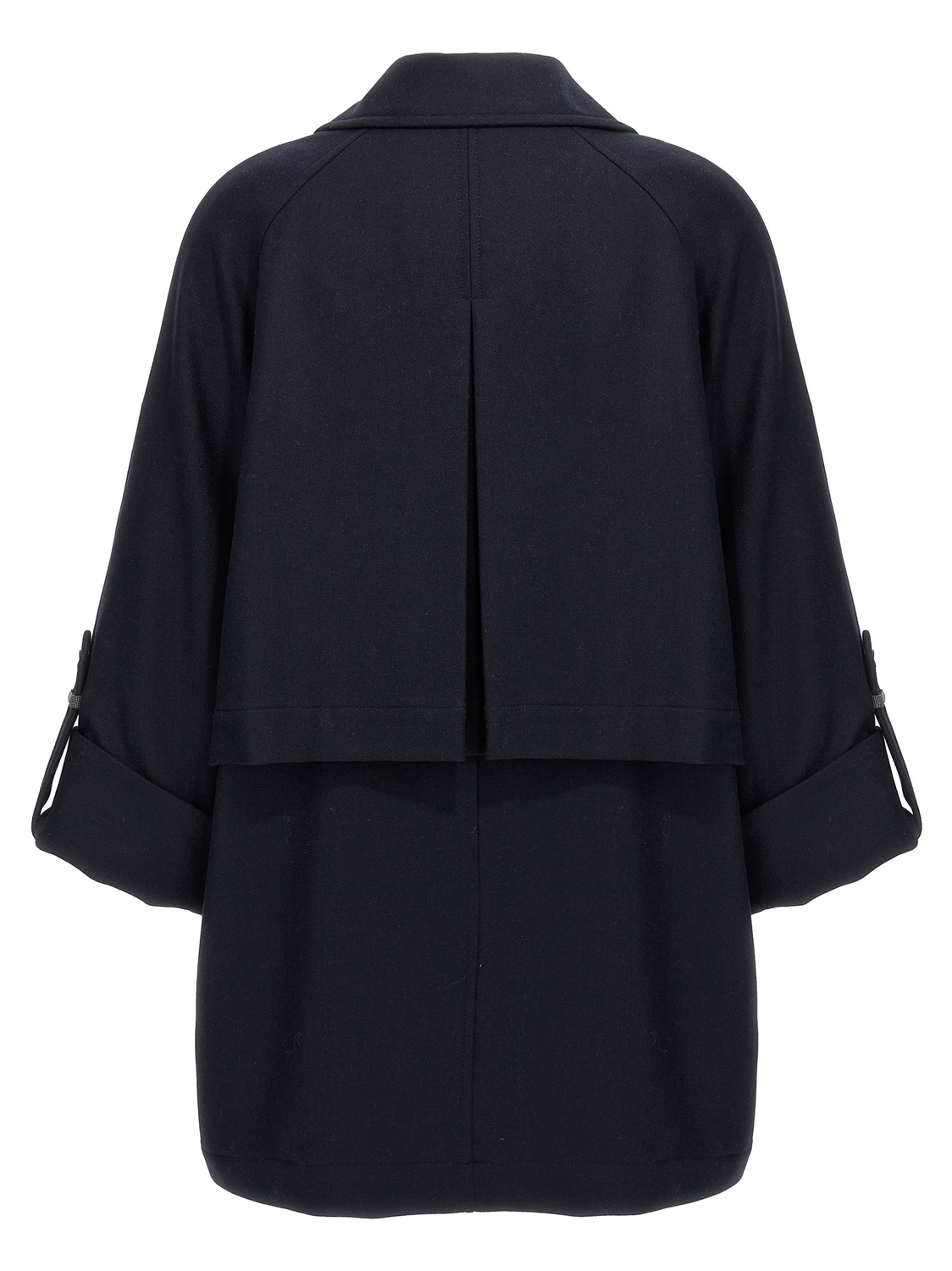 Двубортное пальто-кабан из легкой шерсти с застежкой на пуговицы спереди, карманами, рукавами с широкими манжетами, отделкой Monile 'Shiny Cuff Details', спущенным плечом, задним клапаном-капе и подкладкой из смесового шелкового крепа.