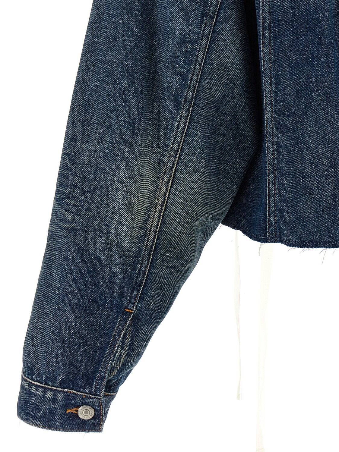 Джинсовая куртка из хлопка со стиркой стоунвош, асимметричным кроем, имитацией бумажника на талии с завязкой из контрастной тесьмы, рубашечным воротником, застежкой на пуговицы спереди, карманами, необработанным краем, длинными рукавами с манжетами и спущенной линией плеч.