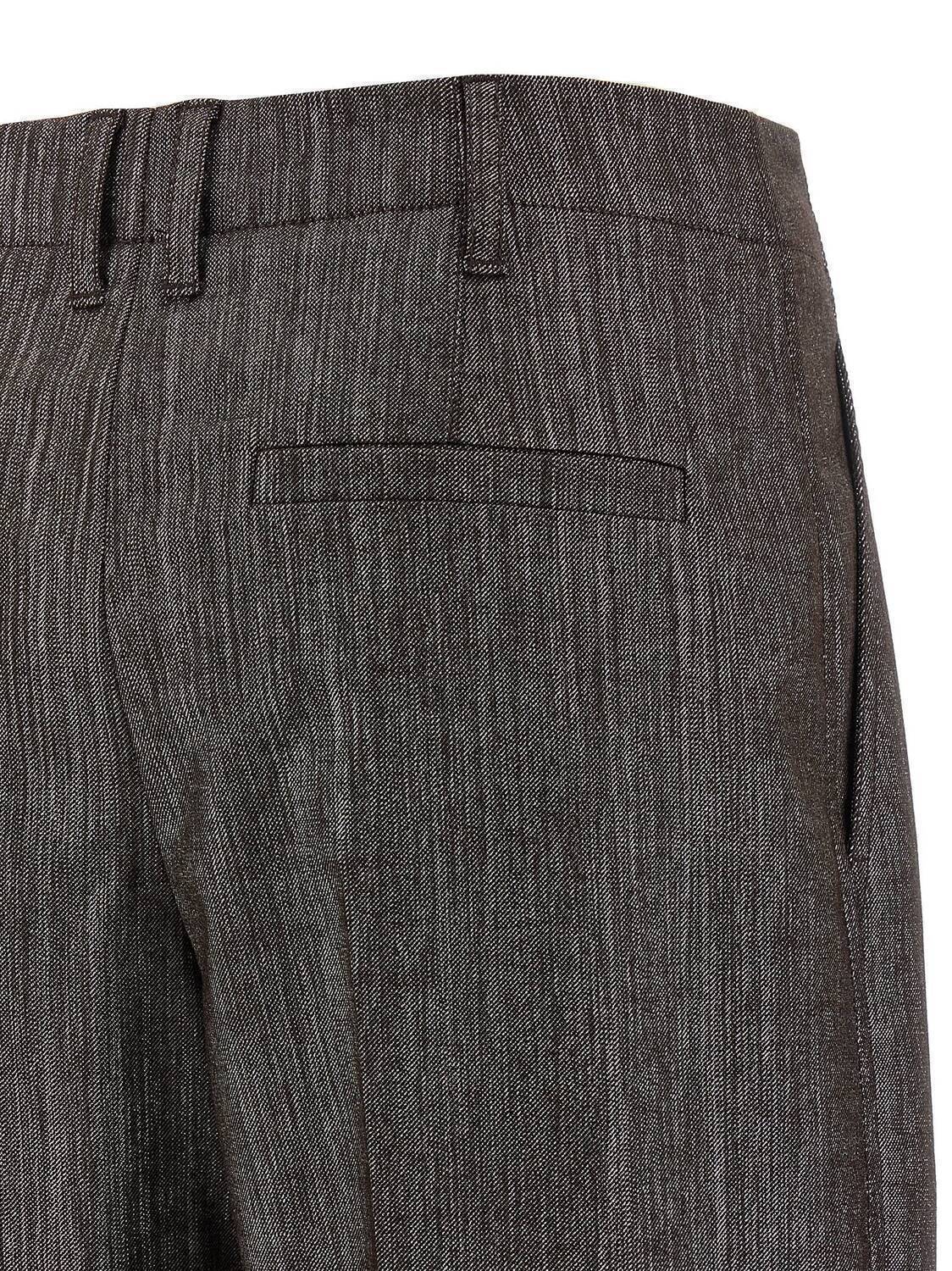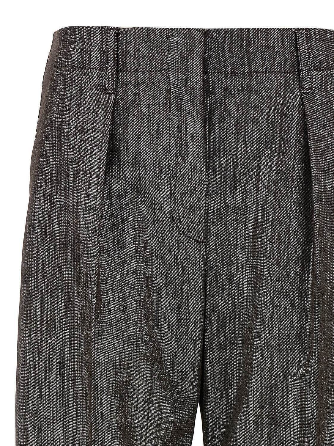Брюки из смеси вискозы и шерсти с люрексовыми нитями, защипами, растянутой стрелкой, застежкой на молнию, крючок и пуговицу спереди, карманами, с отворотом по низу брючины.