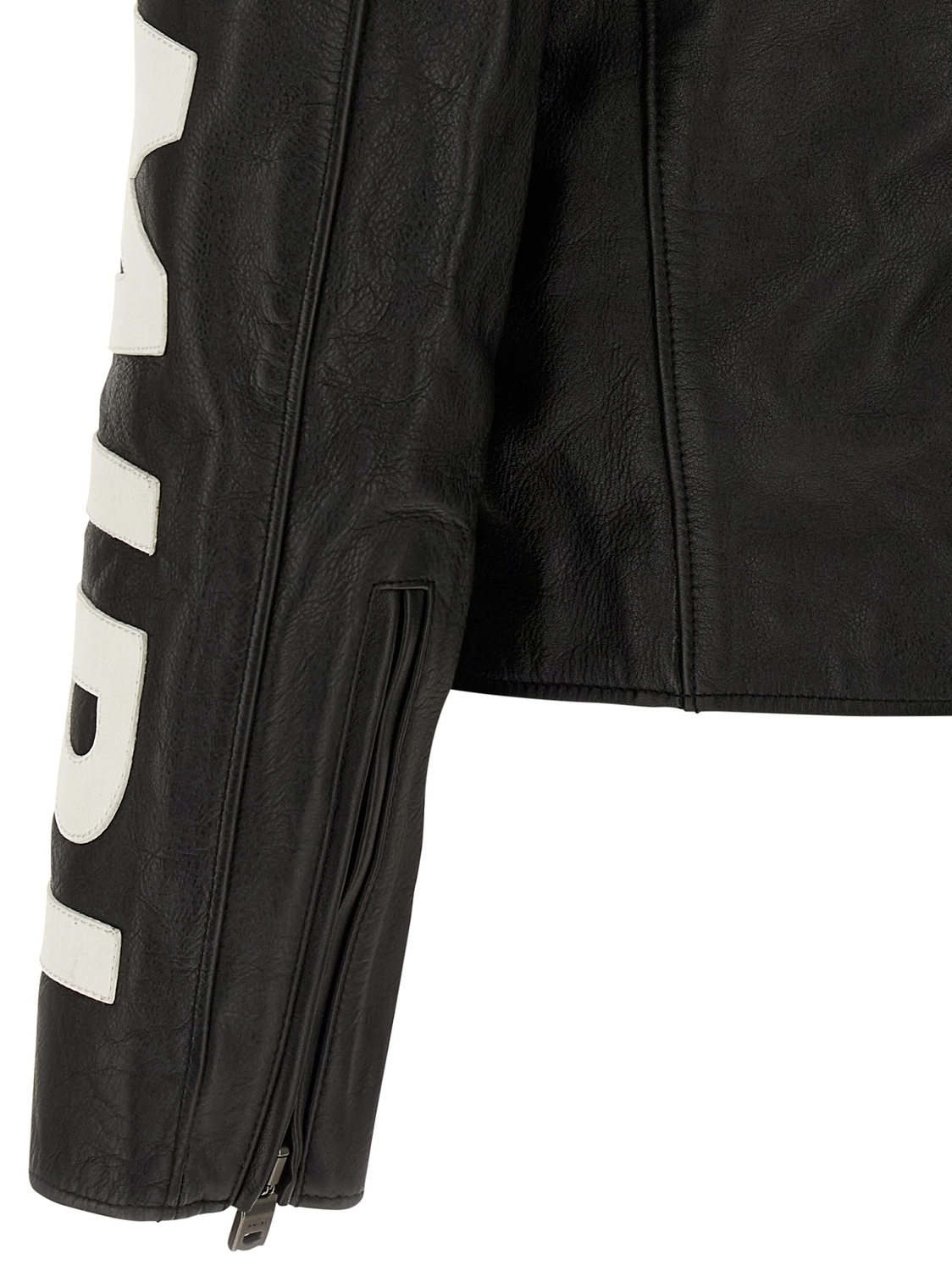 Кожаная куртка 'Amiri Patch Racer' с эффектом состаривания, нашивкой с логотипом, воротником-стойкой, застежкой-молнией спереди, карманами, длинными рукавами с молниями на манжетах.