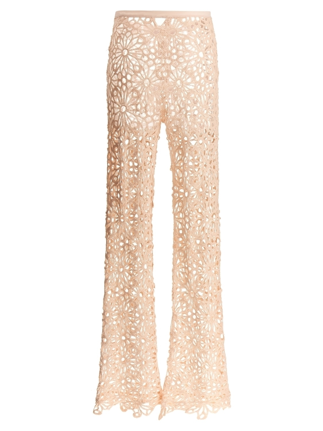 Брюки «Кроче» с цветочным узором, фасон клеш, полупрозрачные, с эластичным поясом.