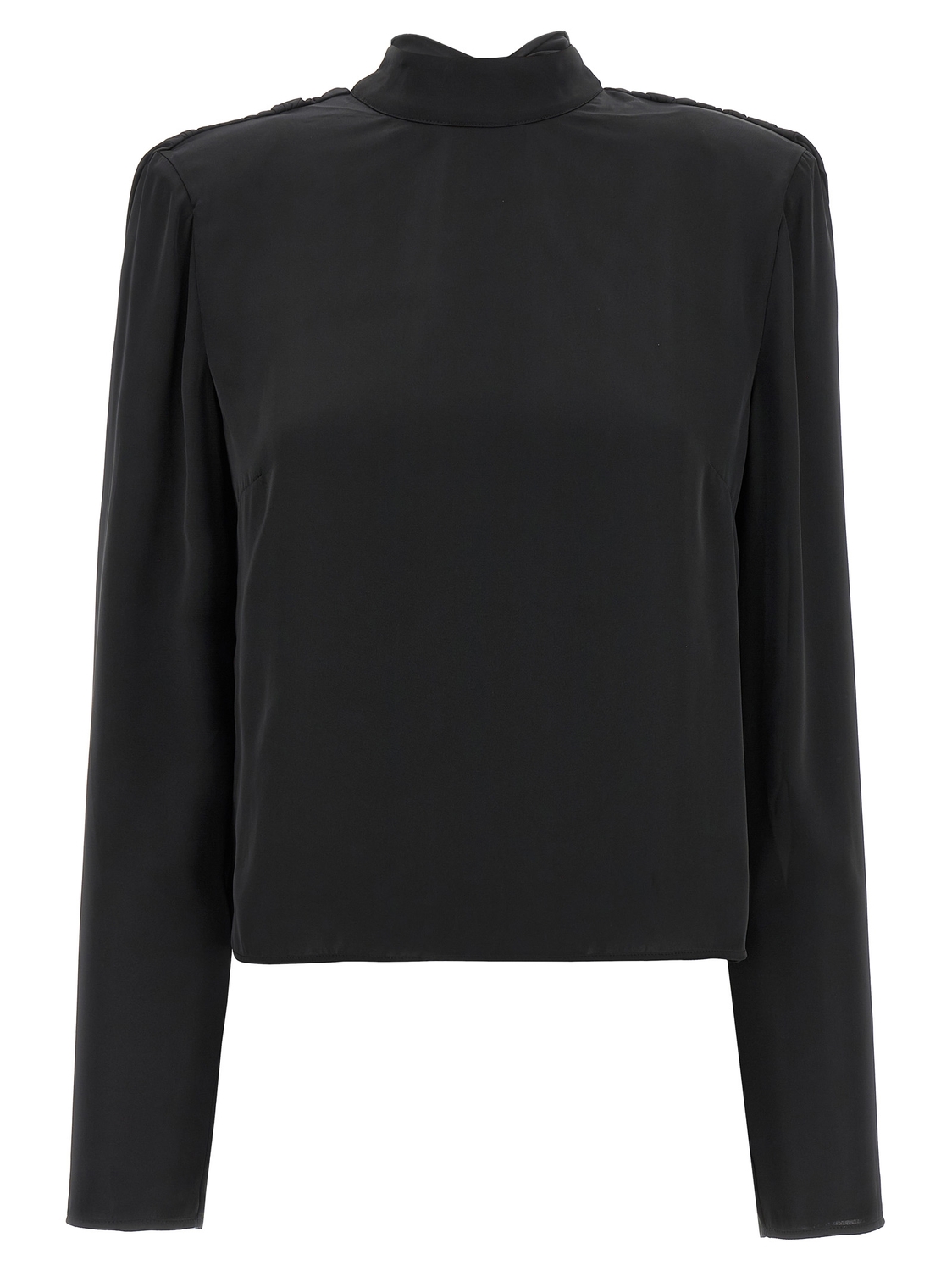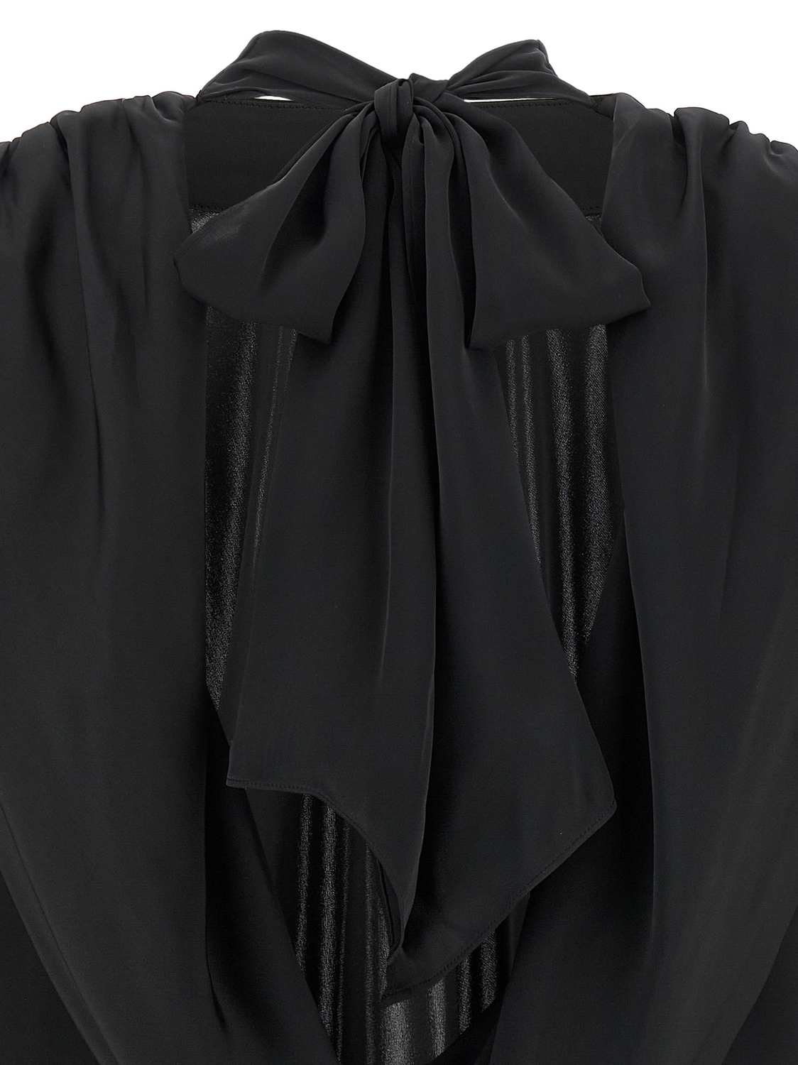 Атласный топ 'Satin Drapy Back', воротник-лавальер, завязывающийся сзади, длинные рукава, съемные подплечники, глубокий драпированный вырез на спине.