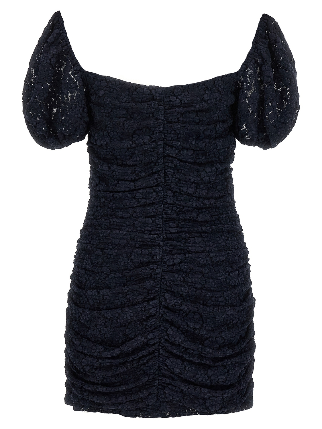 Кружевное мини-платье, вырезы спереди и сзади, короткие пышные рукава на резинке, застежка-молния сбоку, сборки спереди, сзади и по бокам.