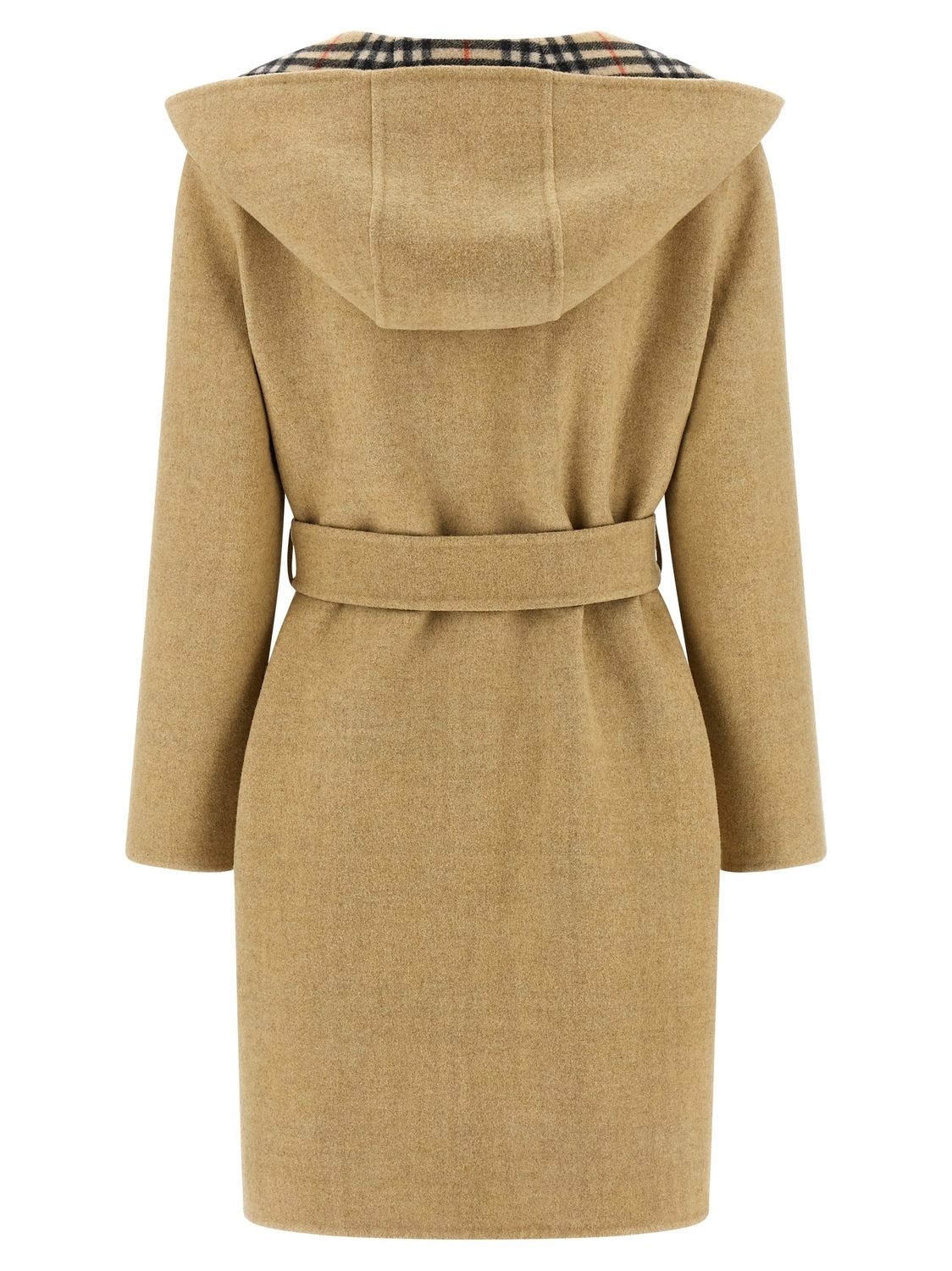 Двустороннее пальто 'Hampshire' из вареной шерсти однотонного цвета с фирменным клетчатым принтом Burberry по всей поверхности, в стиле халата, с капюшоном и съемным поясом.