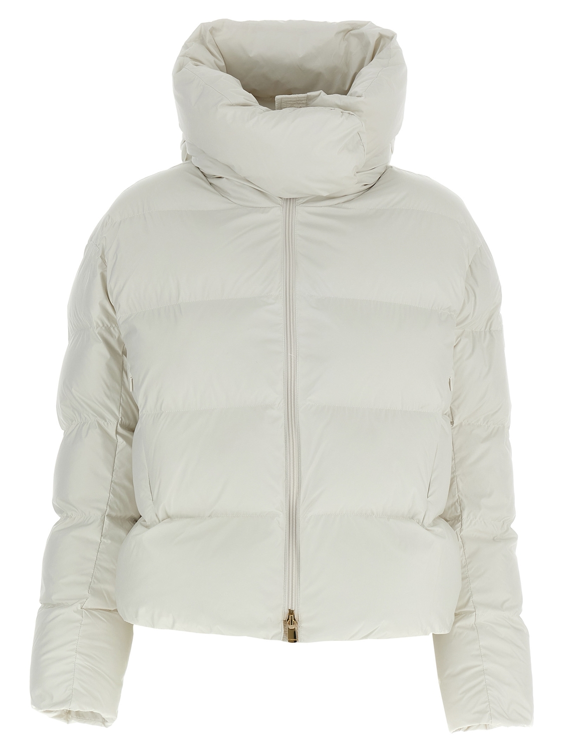 Укороченная стеганая пуховая куртка из технического канваса 'Giza', высокий воротник с застежкой на кнопки, регулируемый капюшон, передняя застежка на молнию, карманы, длинные рукава с вышитым в тон логотипом, кулиска по нижнему краю, боковые разрезы.