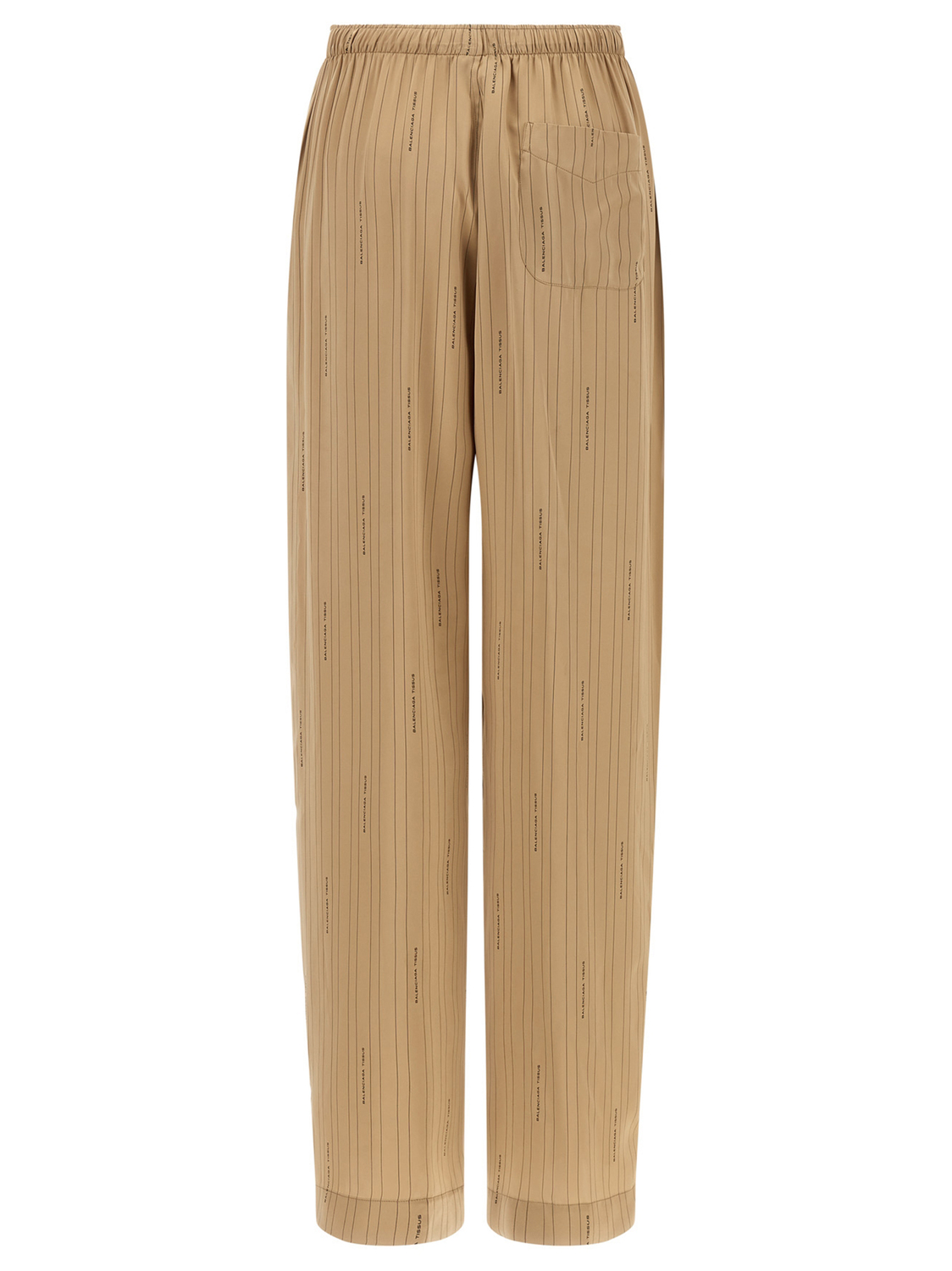 Широкие брюки 'Coocon' из струящейся вискозы в полоску с логотипом 'Balenciaga Tissus' по всей поверхности, регулируемый эластичный пояс со шнурком, планка на пуговицах, карманы.