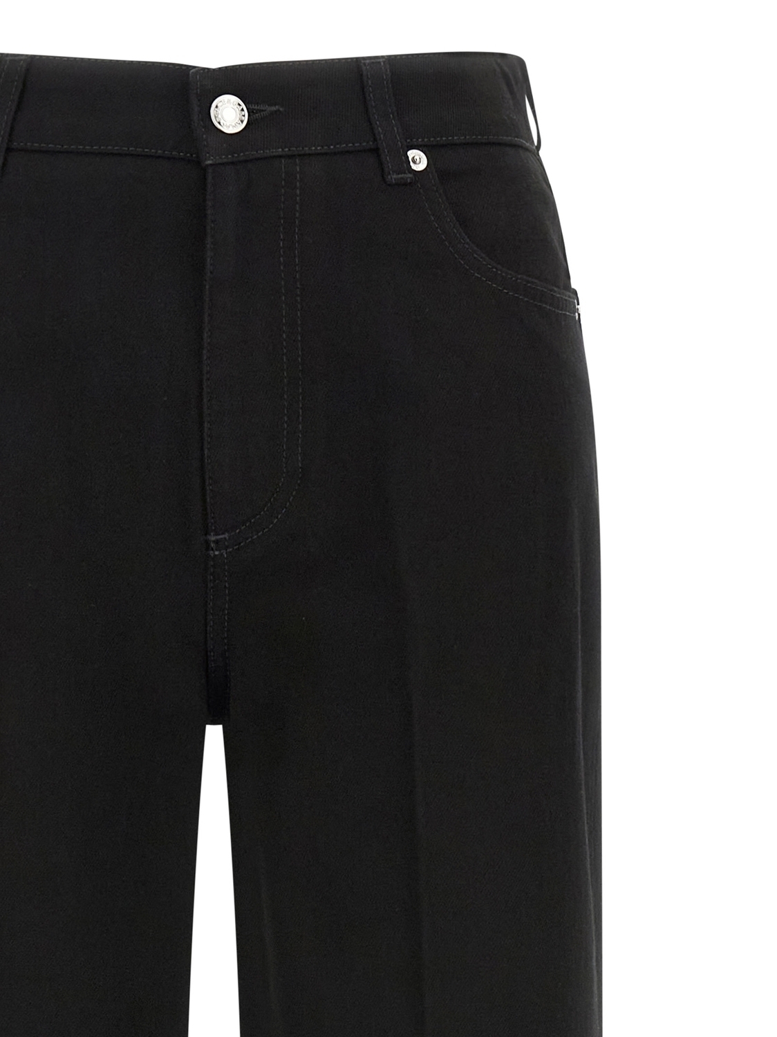 Джинсы из хлопкового денима, расклешенные брючины, передняя отутюженная складка, 5 карманов, застежка на молнию и пуговицу, задняя металлическая нашивка с логотипом.