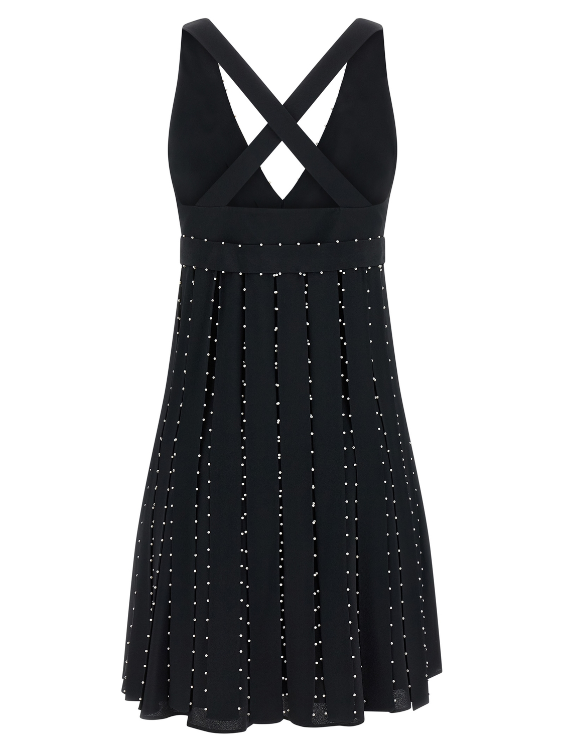 Мини-платье из шелковой смеси с аппликацией из миниатюрных жемчужин и бахромы, с глубоким V-образным вырезом, широкими перекрещивающимися на спине бретелями, без рукавов, застежкой на молнии сбоку и подъюбником.