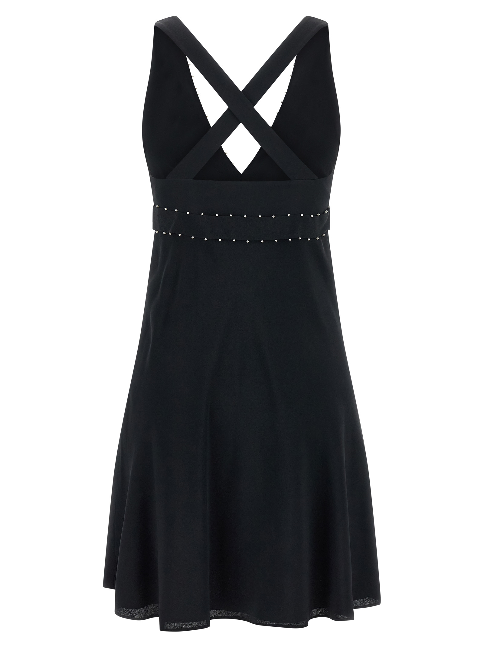 Мини-платье из шелковой смеси с миниатюрными жемчужными аппликациями, широким V-образным вырезом, широкими перекрещенными бретелями на спине, без рукавов, боковой застежкой-молнией, нижней юбкой.