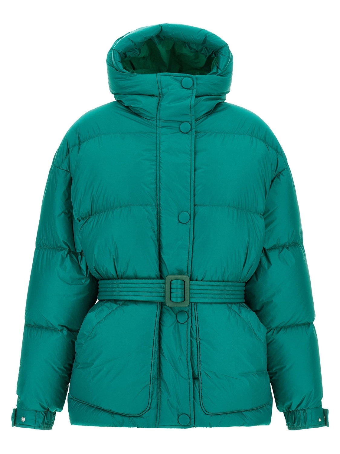 Стеганая нейлоновая пуховая куртка 'Michlin' с наполнителем из гусиного пуха, хлопковой подкладкой, капюшоном, высоким воротником, застежкой на молнию и кнопки спереди, карманами, длинными рукавами с регулируемыми эластичными манжетами и спущенной линией плеч, силуэтом «песочные часы» и съемным ремнем на талии.