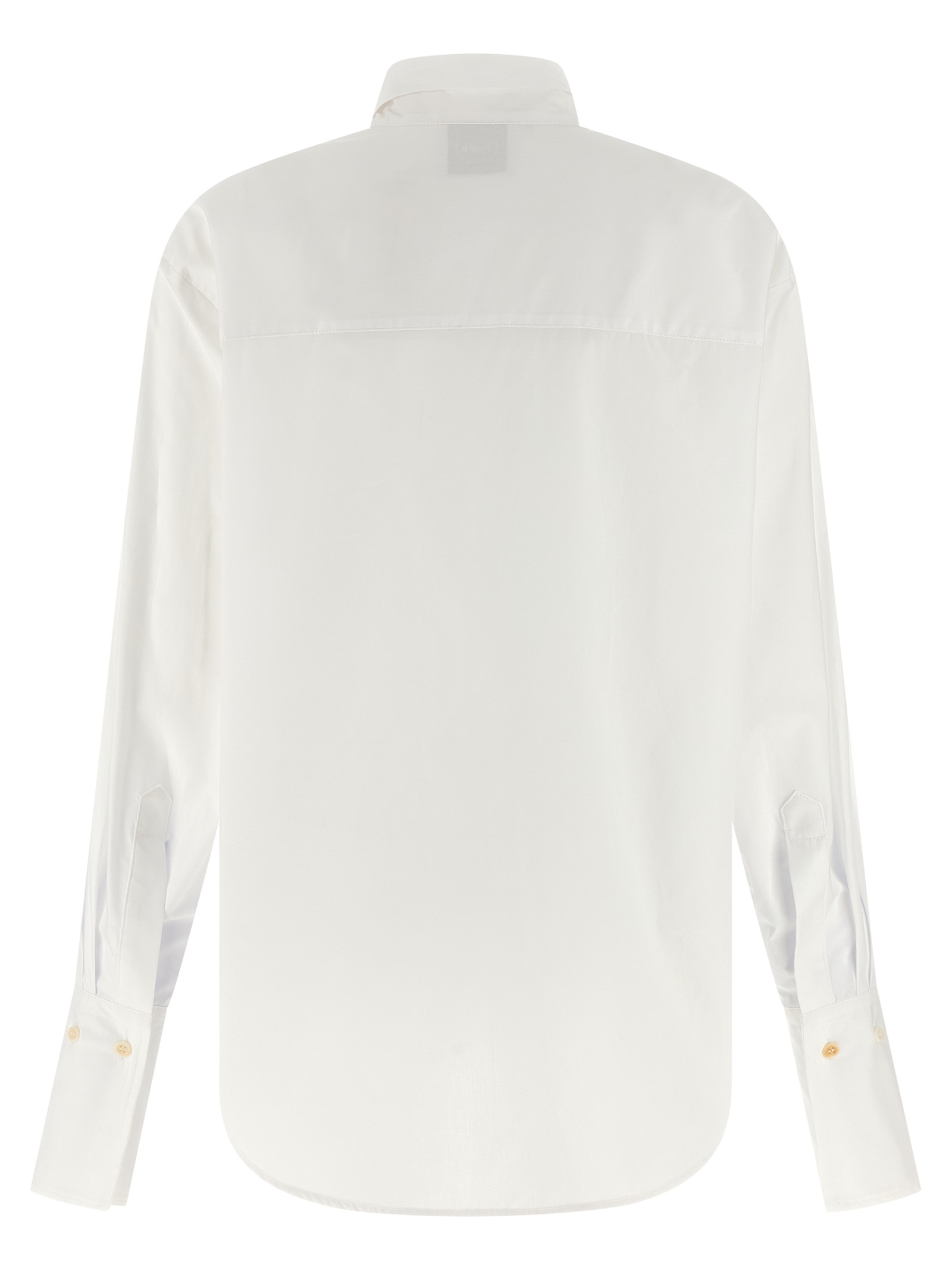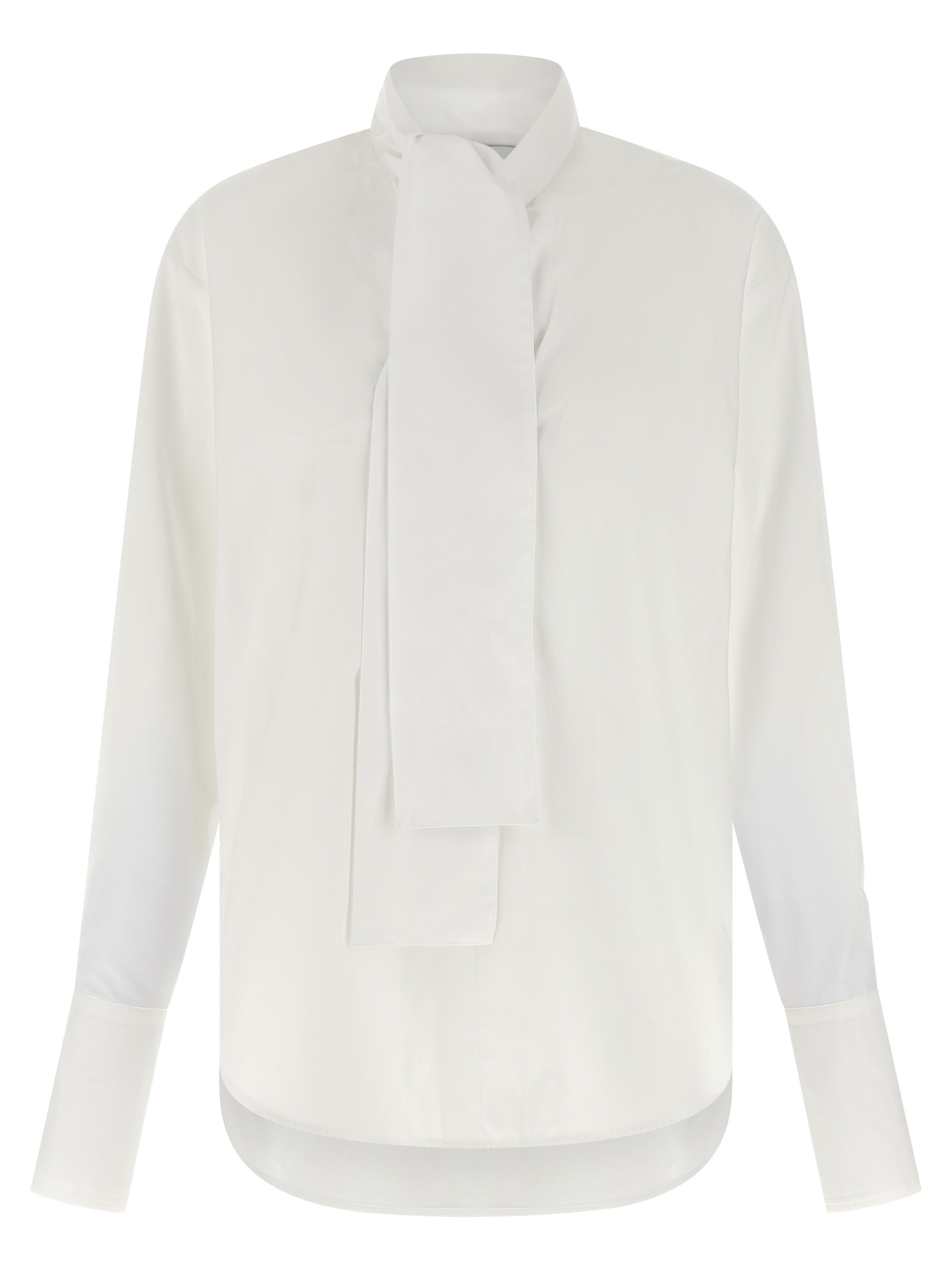 Рубашка из хлопкового поплина, воротник лавашьер с галстуком-ленточкой и V-образным вырезом, длинные рукава с удлиненными манжетами, боковые разрезы и асимметричный подол.