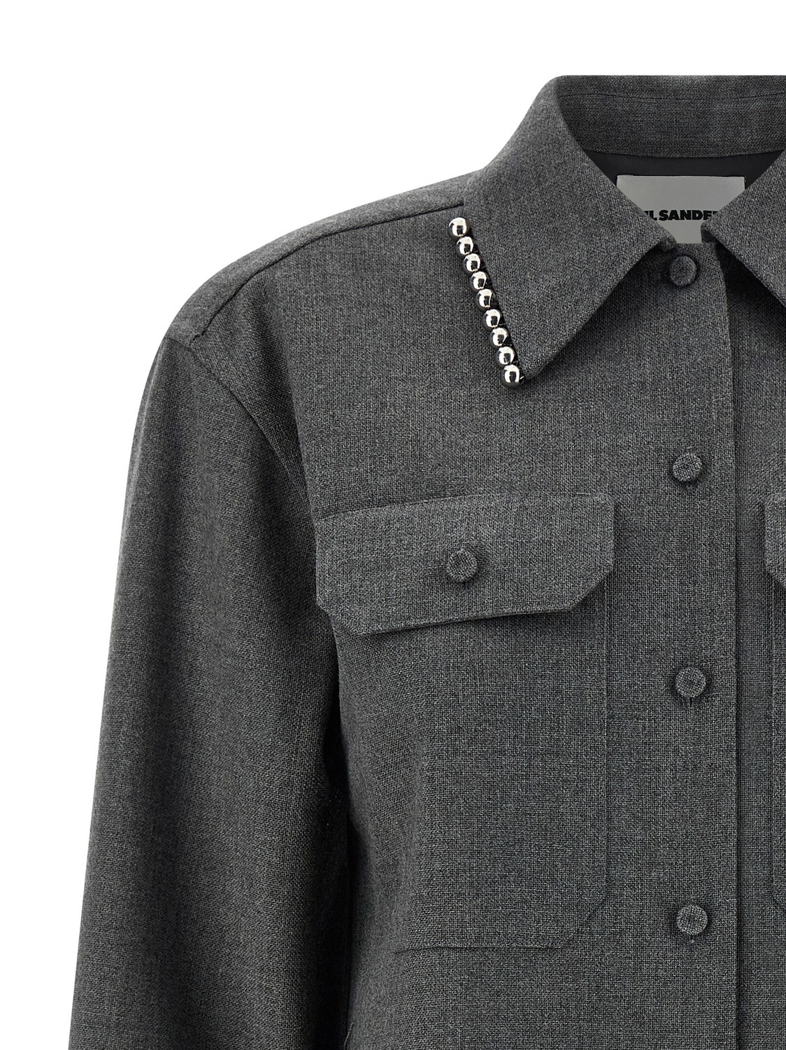Рубашка из шерстяного канваса, воротник, застежка спереди на скрытые пуговицы, накладные карманы спереди, длинные рукава, манжеты на пуговицах.