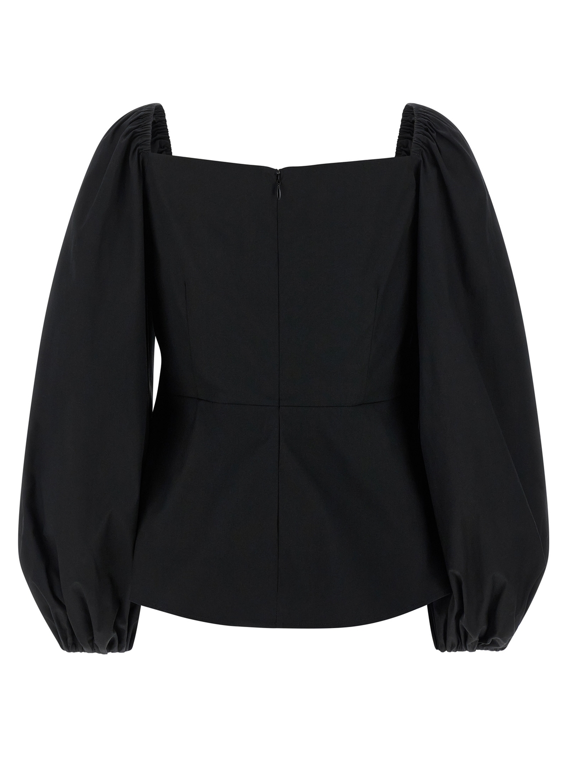 Топ из хлопкового поплина с объемными рукавами, круглым вырезом с подкладкой из проволоки и волной по центру, застежкой на молнию и крючок сзади.
