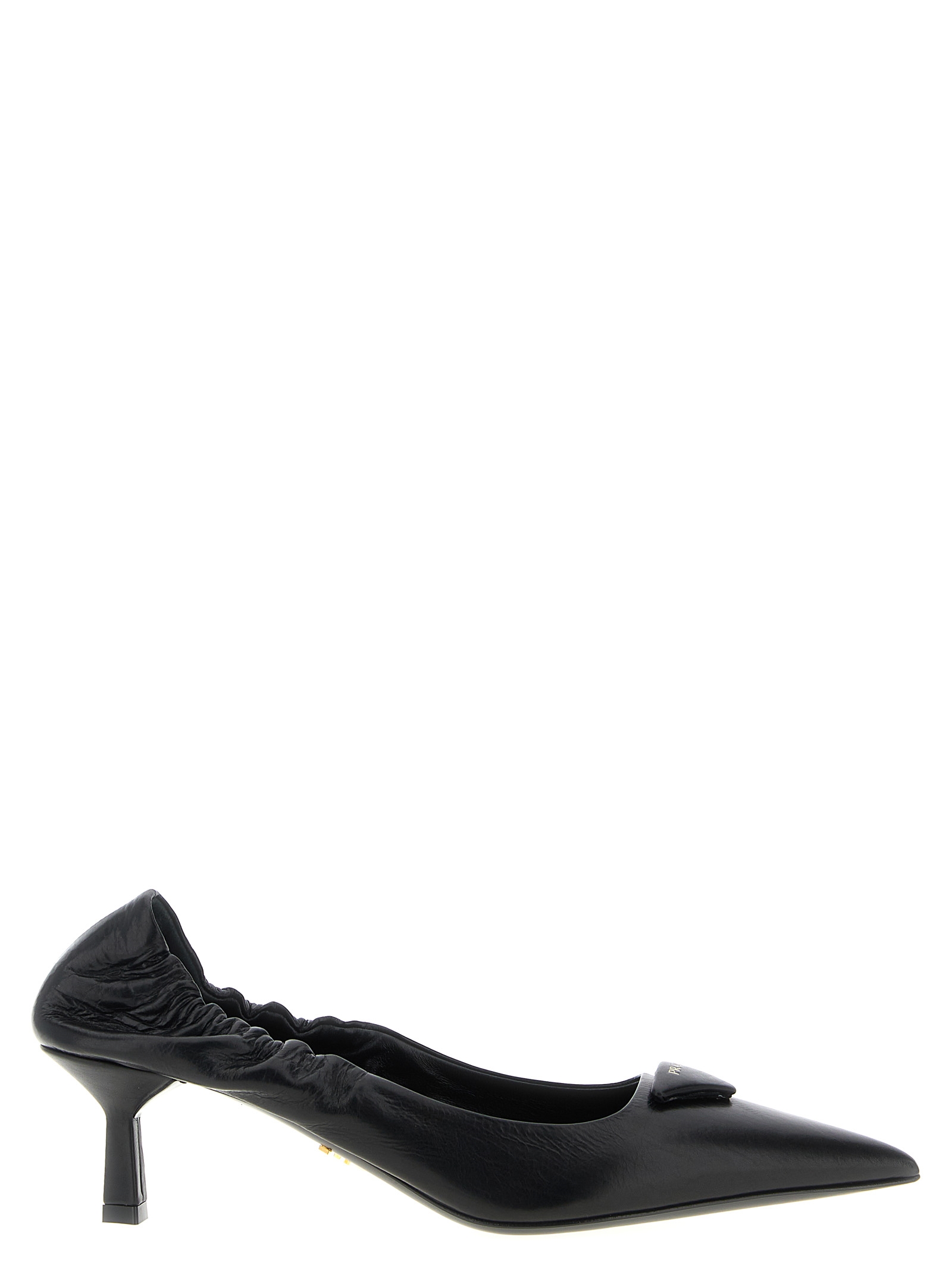 Кожаные заостренные туфли-лодочки с треугольным логотипом в тон с тиснением спереди, эластичной вставкой сзади, архитектурным каблуком, вдохновленным геометрией культового треугольника, кожаной подошвой.