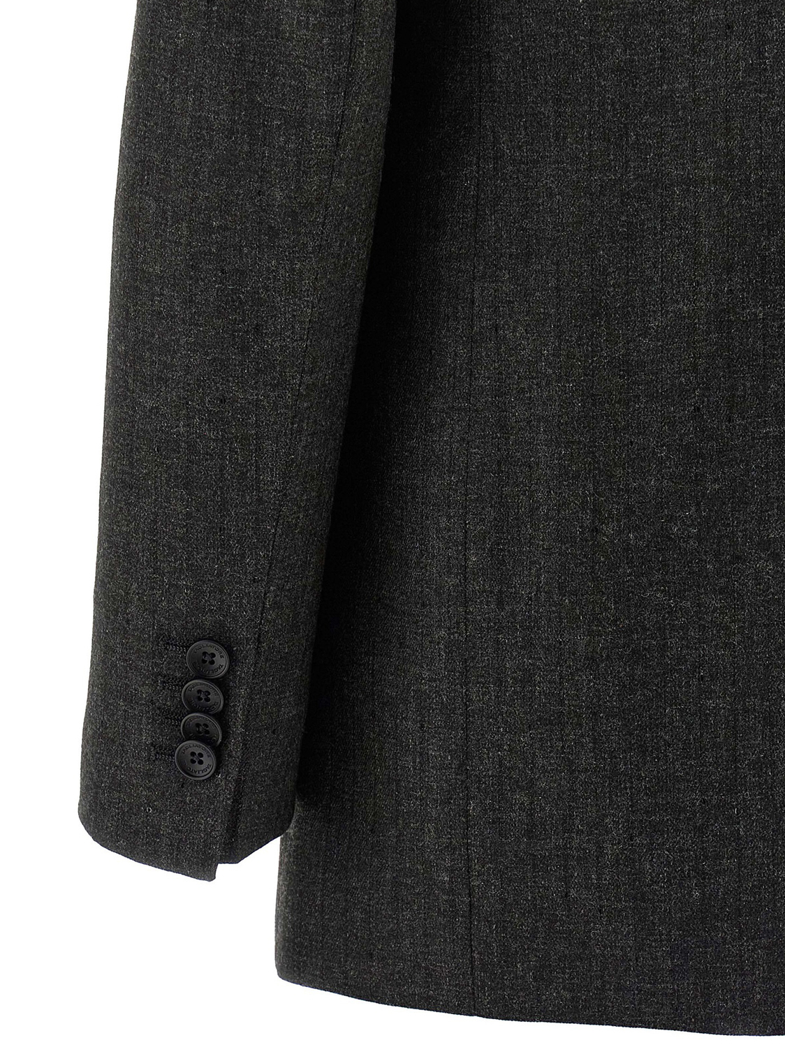 Платье 'Jasmine' из смесовой ткани вискозы и шерсти меланж с вышивкой пайетками по всей поверхности, состоящее из двубортного пиджака с застежкой на пуговицы спереди, лацканами с острыми концами, нагрудным карманом, карманами с клапанами, подплечниками, длинными рукавами, разрезом сзади и брюк со стрелками, застежкой на молнию и крючок спереди, карманами, прямыми штанинами.