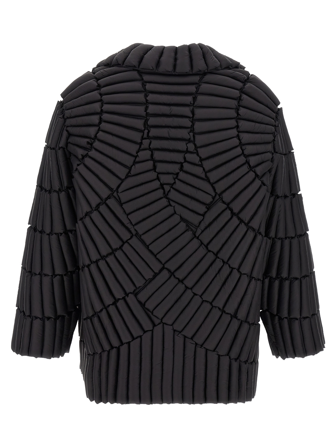 Пуховик из нейлона с 3D-структурой и наполнителем из гусиного пуха, в стиле кардигана с асимметричной магнитной застежкой спереди, рубашечным воротником, карманами, длинными рукавами со спущенной линией плеч.