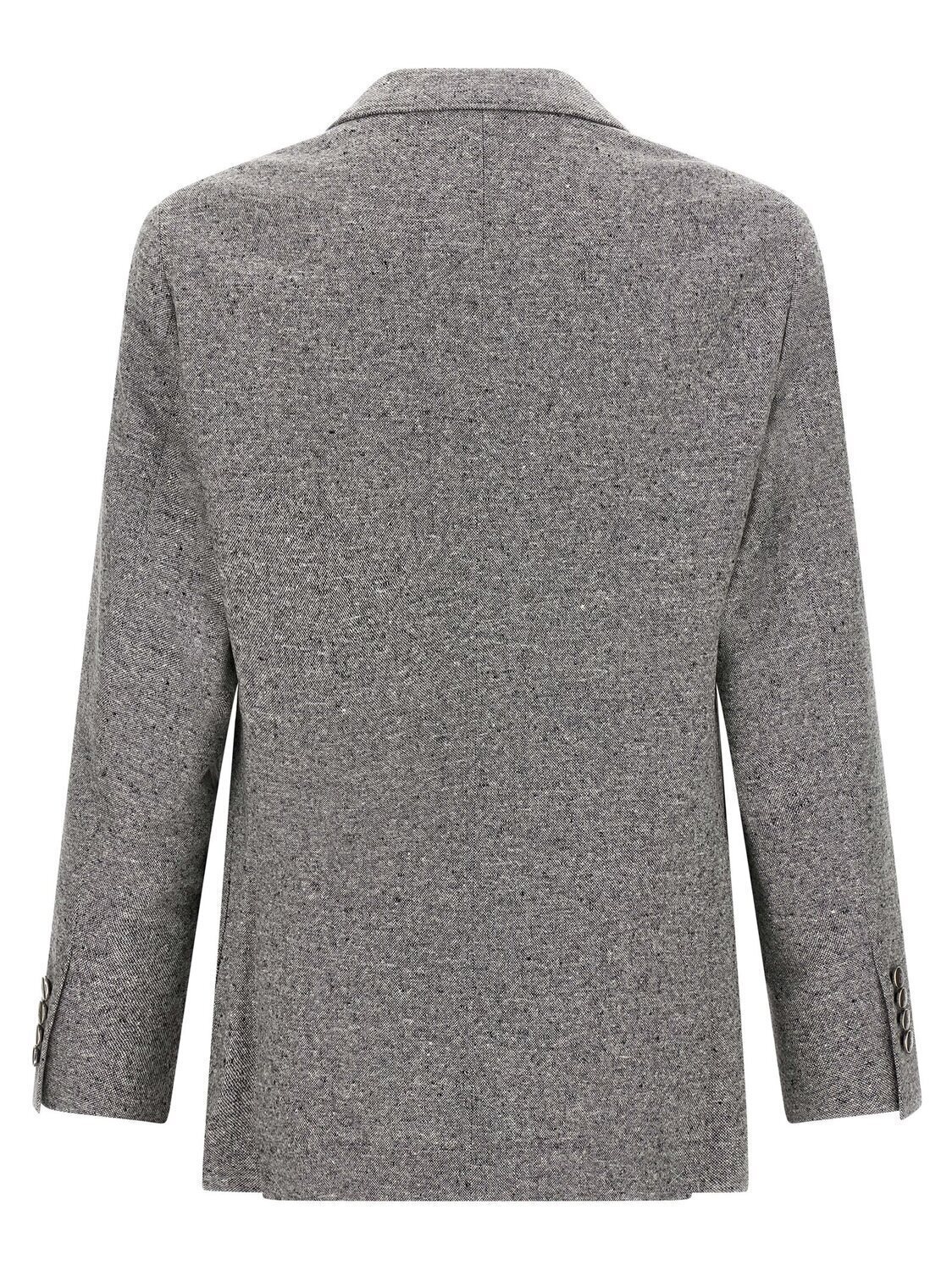 Платье-грисайль из шерсти и кашемира, состоящее из однобортного пиджака с полутора бортами на пуговицах, накладных карманов спереди, длинных рукавов с пуговицами; Прямые брюки, передняя стрейч-складка, застежка на молнию и крючок, карманы.