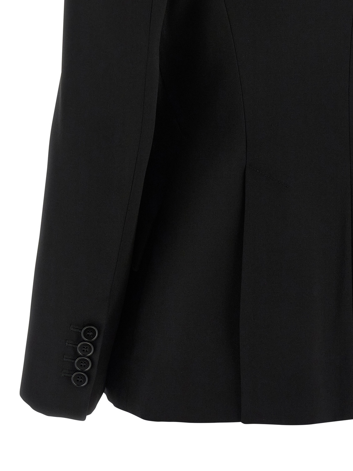 Однобортный пиджак из ткани "грэн-де-пудр" с силуэтом "песочные часы", застежкой на пуговицу спереди, лацканами-«зеркало», нагрудным карманом, косыми клапанами на карманах, слегка заостренными подплечниками, длинными рукавами, боковыми разрезами, подкладкой из купро.