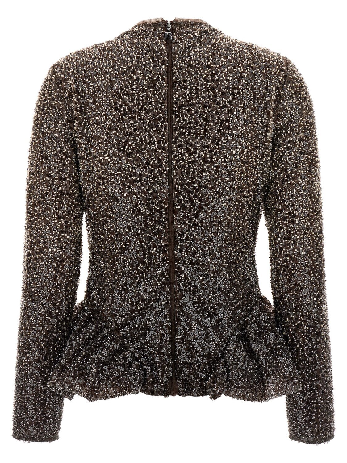 Топ из ткани, покрытый пайетками и бусинами по всей поверхности, с баской на талии, высоким воротом, застежкой-молнией сзади, длинными рукавами, на подкладке.