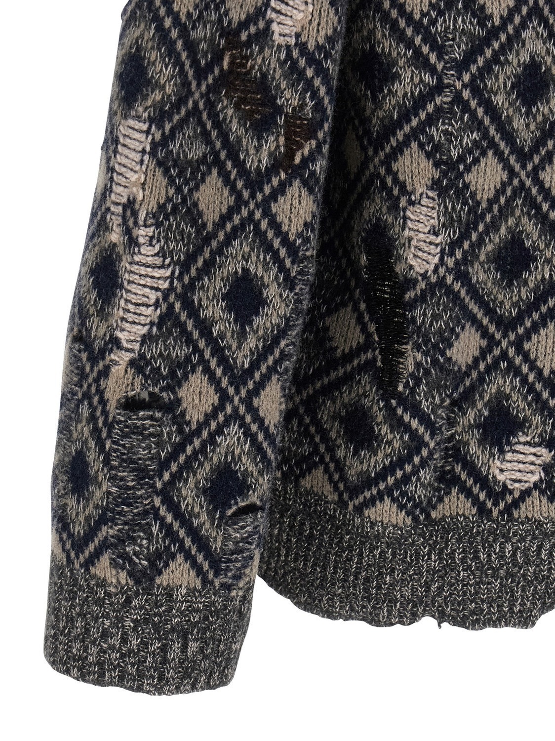 Кардиган из шерсти мериноса Sibling с ручной штопкой, вырезами, нашивкой-логотипом из шенилла и застежкой на пуговицы спереди, V-образным вырезом, длинными рукавами с манжетами и заниженными плечами.
