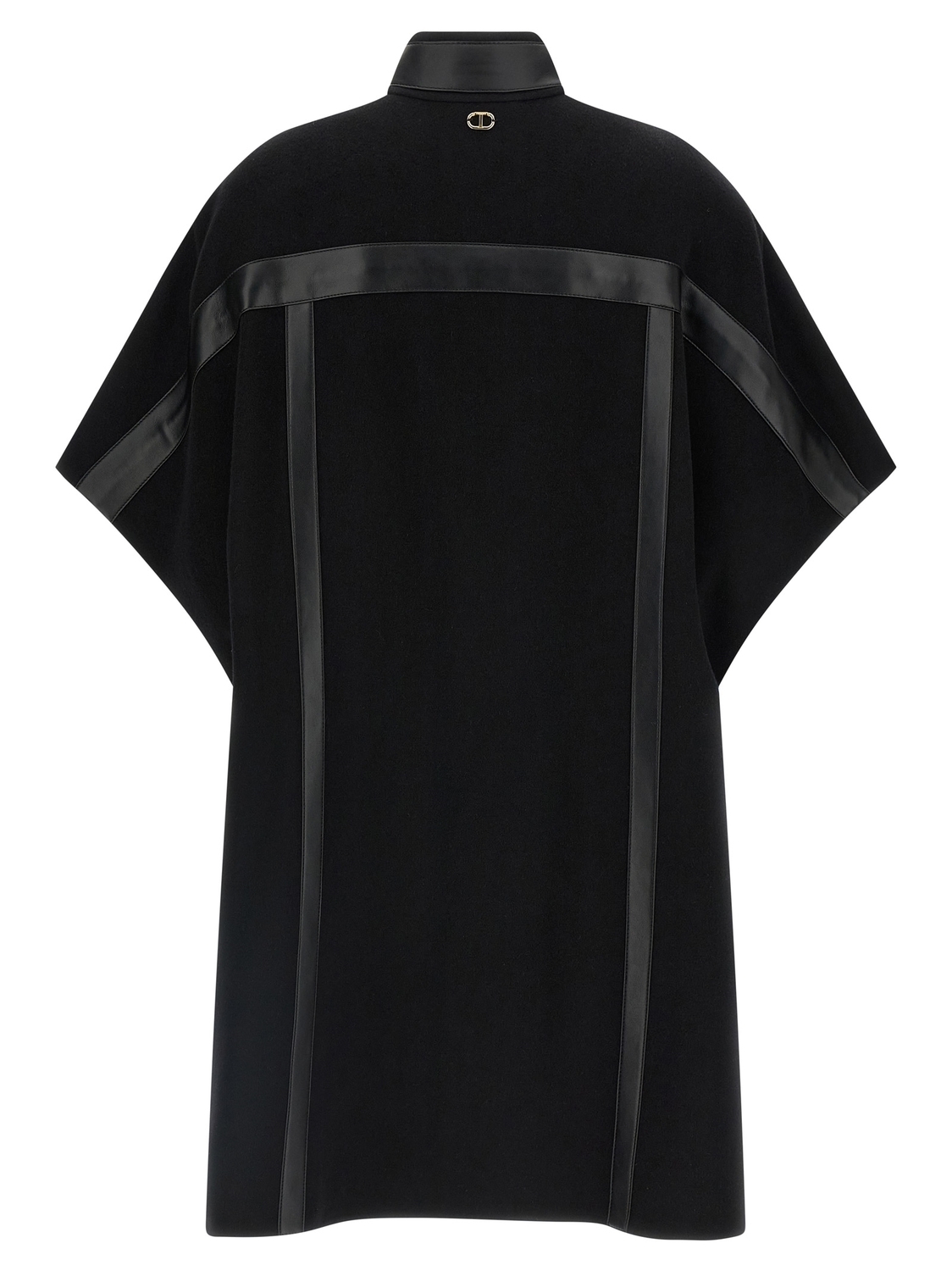 Шерстяная накидка с однотонными деталями из ткани под кожу, металлической пластиной с логотипом на спине, высоким воротником, застежкой-ремешком спереди, короткими рукавами, боковыми разрезами на пуговицах.