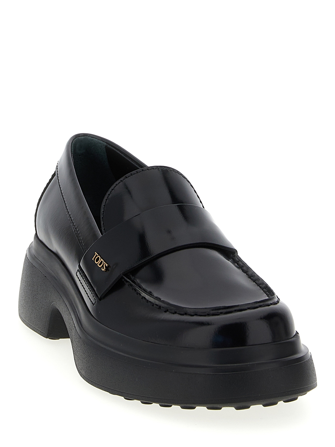 Лоферы из полированного телячьего кожи с боковым металлическим логотипом, массивной резиновой подошвой с рельефными вставками.