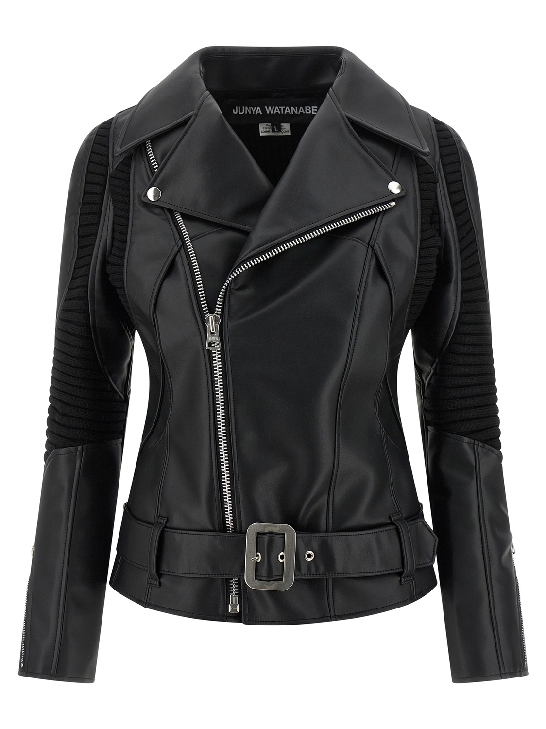 Куртка с эффектом кожи с вырезами и вставками из эластичного рифленого трикотажа, асимметричной застежкой-молнией спереди, карманами, длинными рукавами с молнией на манжетах и съемным поясом.