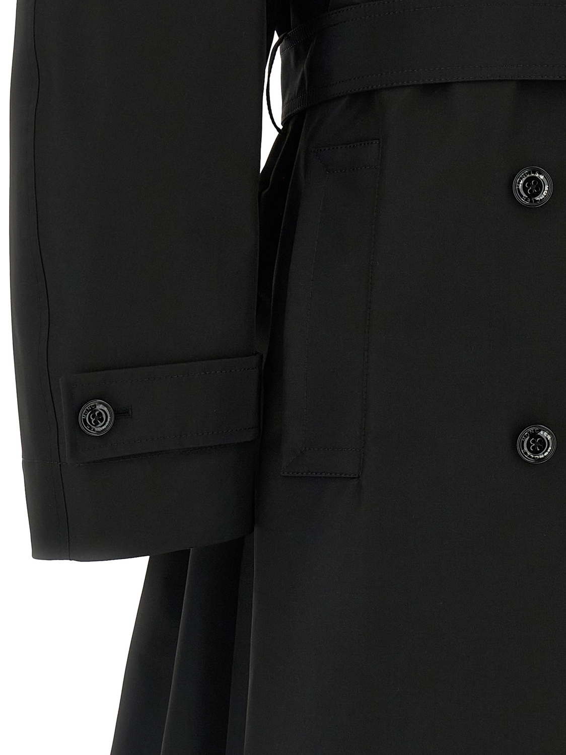 Плащ Moncler x Edward Enninful 'Zake' из водоотталкивающей технической ткани с лацканами, двубортным фасоном с застежкой на пуговицы спереди, карманами, длинными рукавами с манжетами и нашивкой-логотипом в тон, без подкладки, с кейпом и кокеткой на спинке, а также съемным поясом.