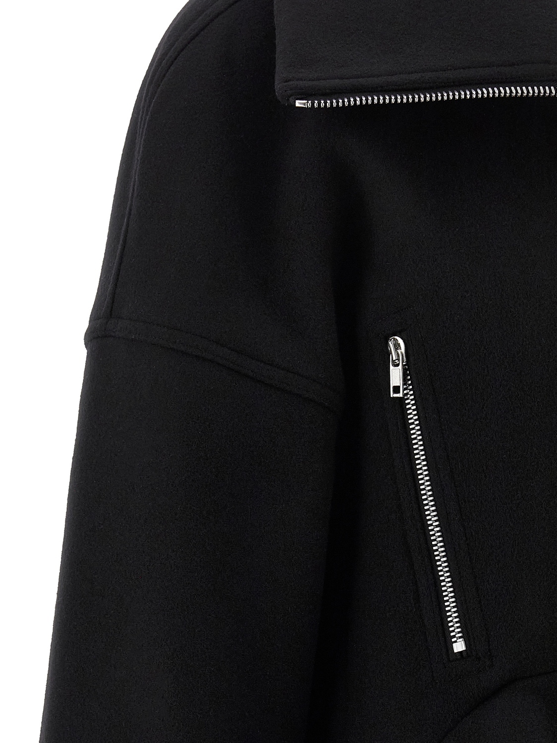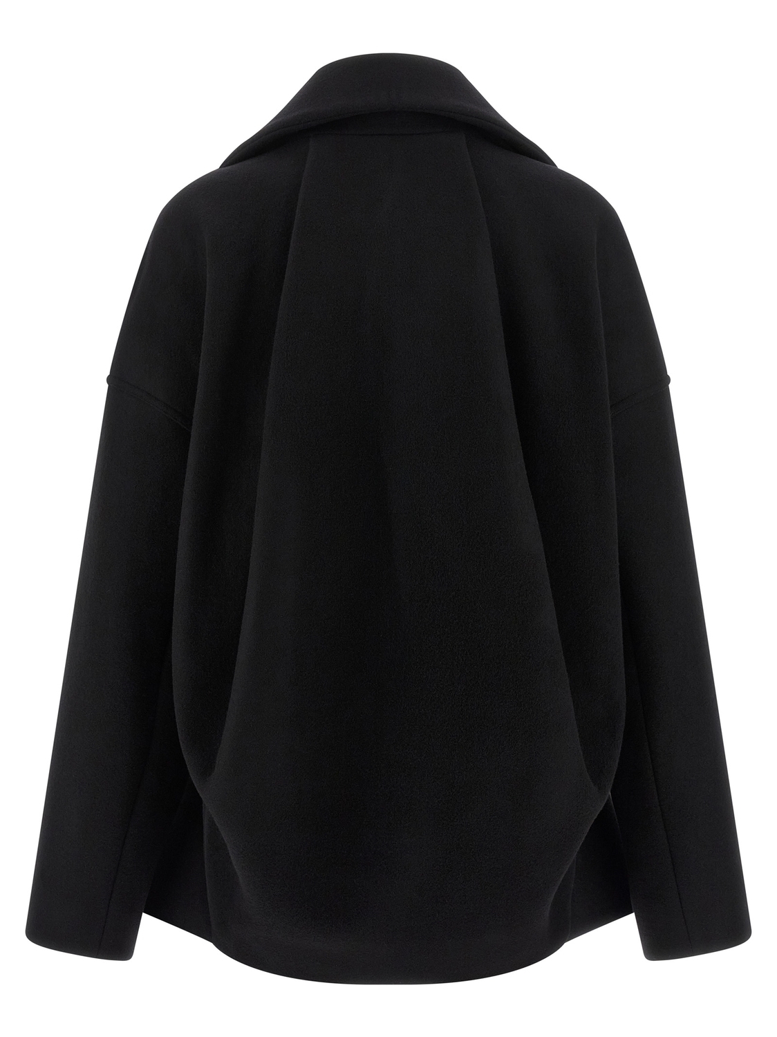 Пальто из ткани из шерсти верджин 'Draculimo' со складным усиленным высоким воротником, застежкой-молнией спереди, карманами, длинными рукавами со спущенной линией плеч, асимметричным низом с слегка приподнятым изогнутым передом.
