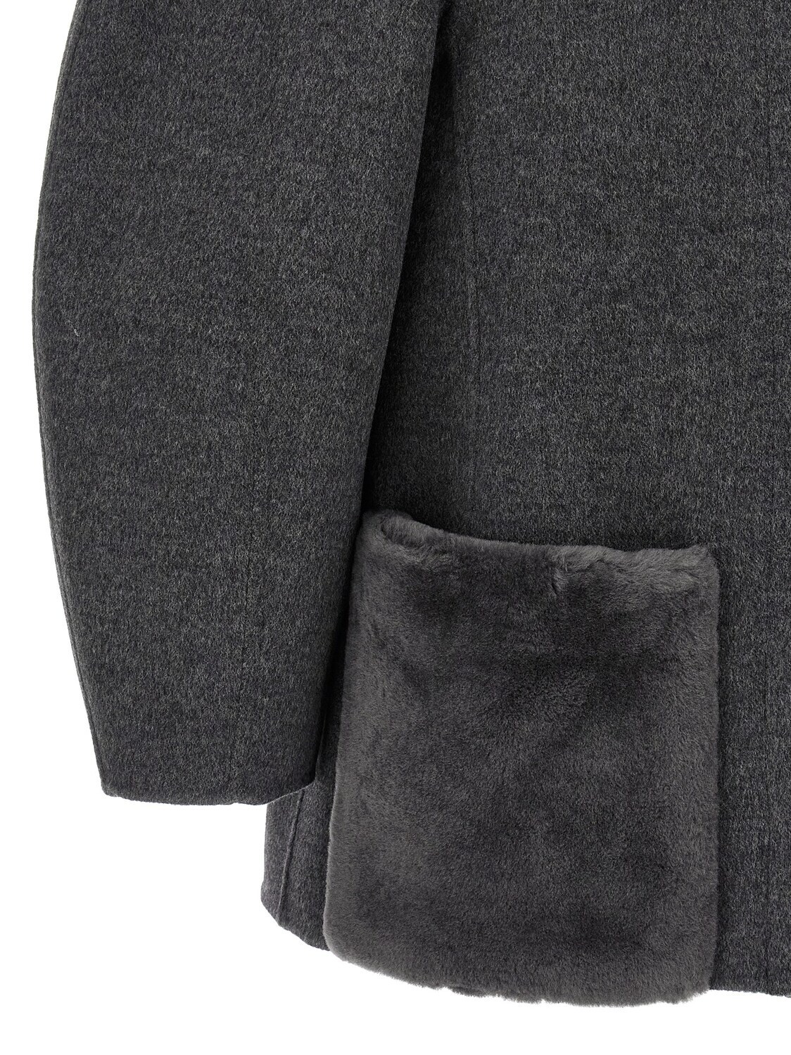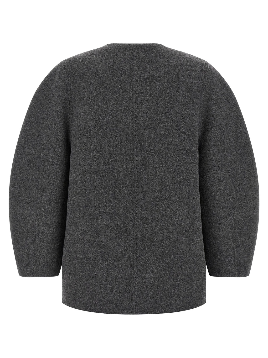 Блузон из двойной меланжевой шерстяной ткани с коконной линией, однобортным воротником с потайной застежкой на пуговицы спереди, карманами из овчины, длинными широкими изогнутыми рукавами и индивидуальной подкладкой с тон-в-тон узором FF.