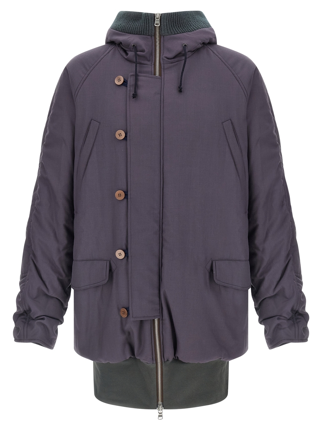 Пальто-парка Kenny длиной 3/4 из натуральной шерсти с контрастными деталями из рубчатого трикотажа, утепленной хлопковой подкладкой, регулируемым капюшоном, дополнительным воротником, застежкой на молнию и пуговицы спереди, карманами, длинными рукавами с внутренними манжетами и повязкой на голову.