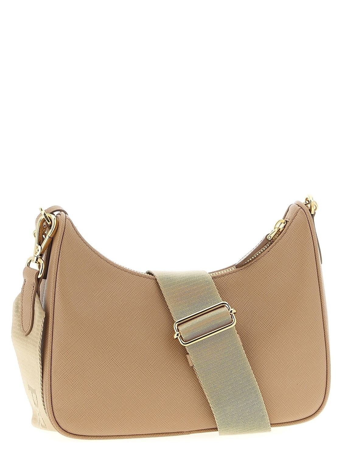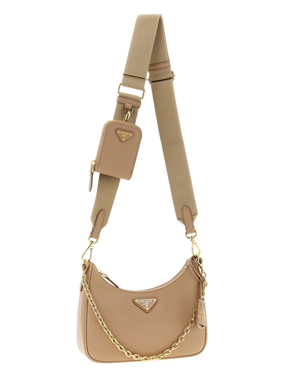 Плечевая сумка Prada Re-Edition 2005 из сафьяновой кожи с передним эмалированным металлическим логотипом в форме треугольника, верхней застежкой на молнию, тканевым плечевым ремнем с регулируемым и съемным жаккардовым логотипом, съемной цепочной ручкой, съемным кошельком, съемным кожаным и металлическим брелоком для ключей.