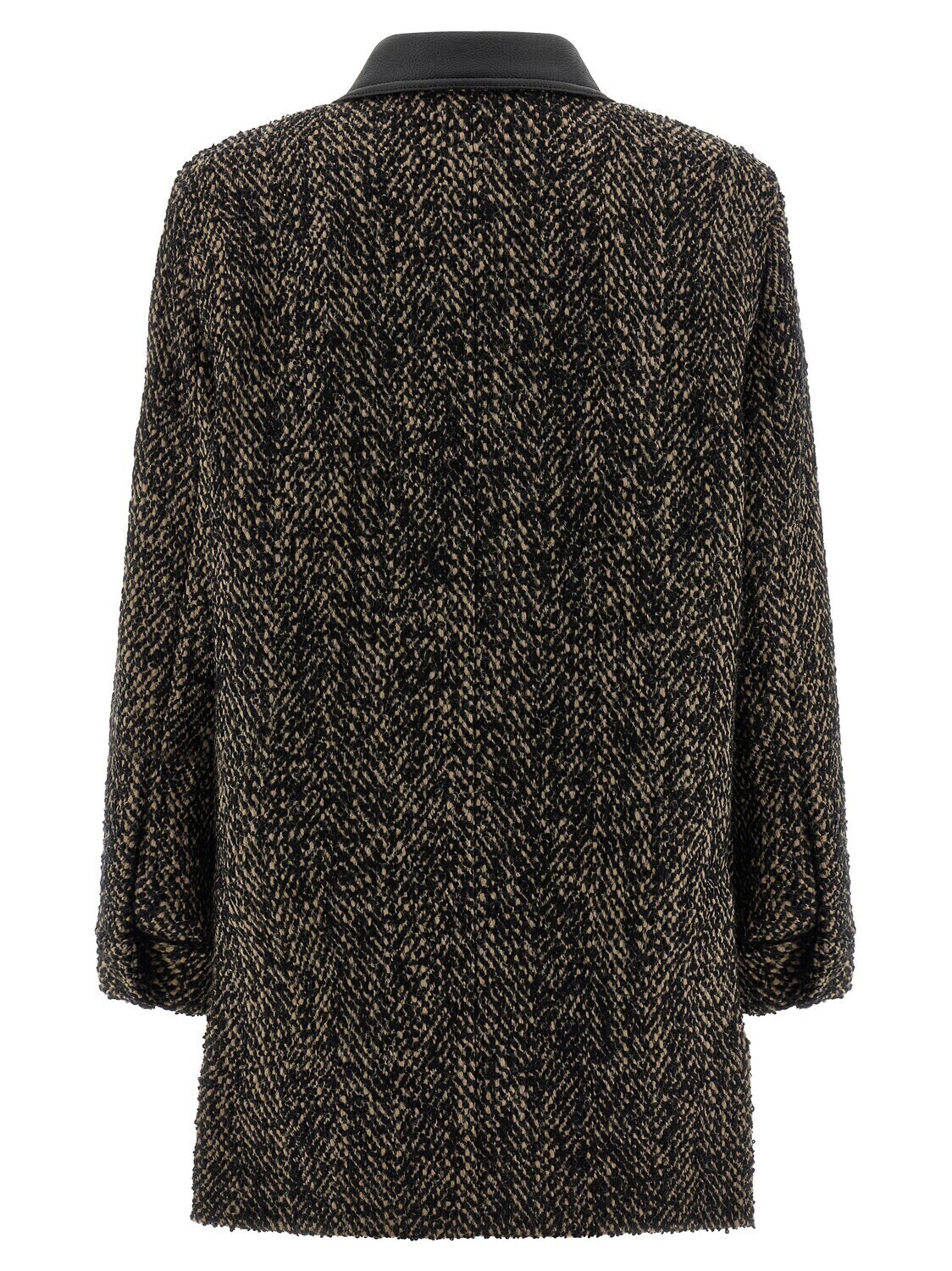 Пиджак-сахарская куртка из шерстяного твида 'Angio12334' с кожаным воротником-рубашкой, застежкой на молнию и кнопки спереди, карманами, длинными широкими рукавами с манжетами, разрезами сзади, подкладкой из вискозы.