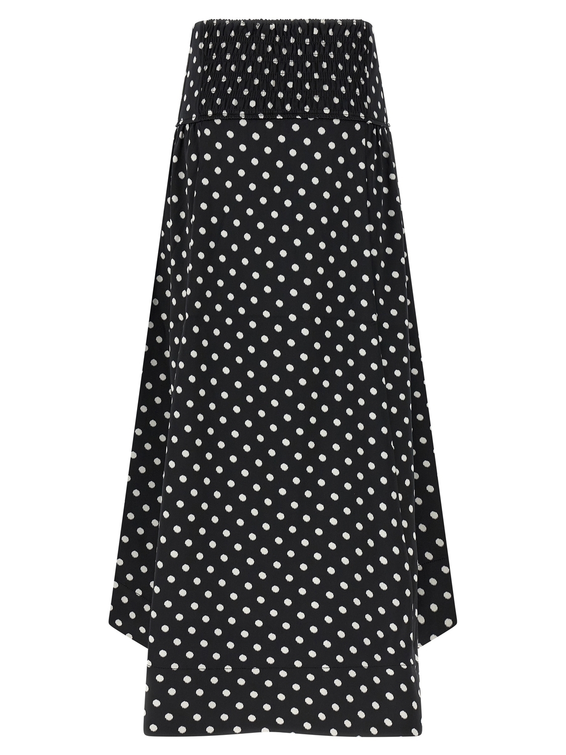 Юбка из ткани с эффектом шелка в горошек, со сборкой на спинке, съемным передним карманом, фасон «солнце», боковая застежка на скрытую молнию.