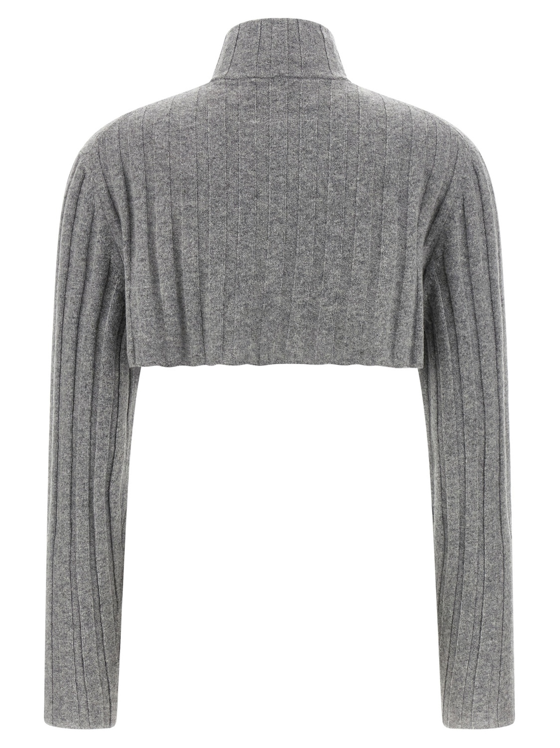 Укороченный кардиган из шерстяного трикотажа в рубчик, нашивка-логотип спереди, высокий ворот, металлическая молния спереди, длинные рукава.