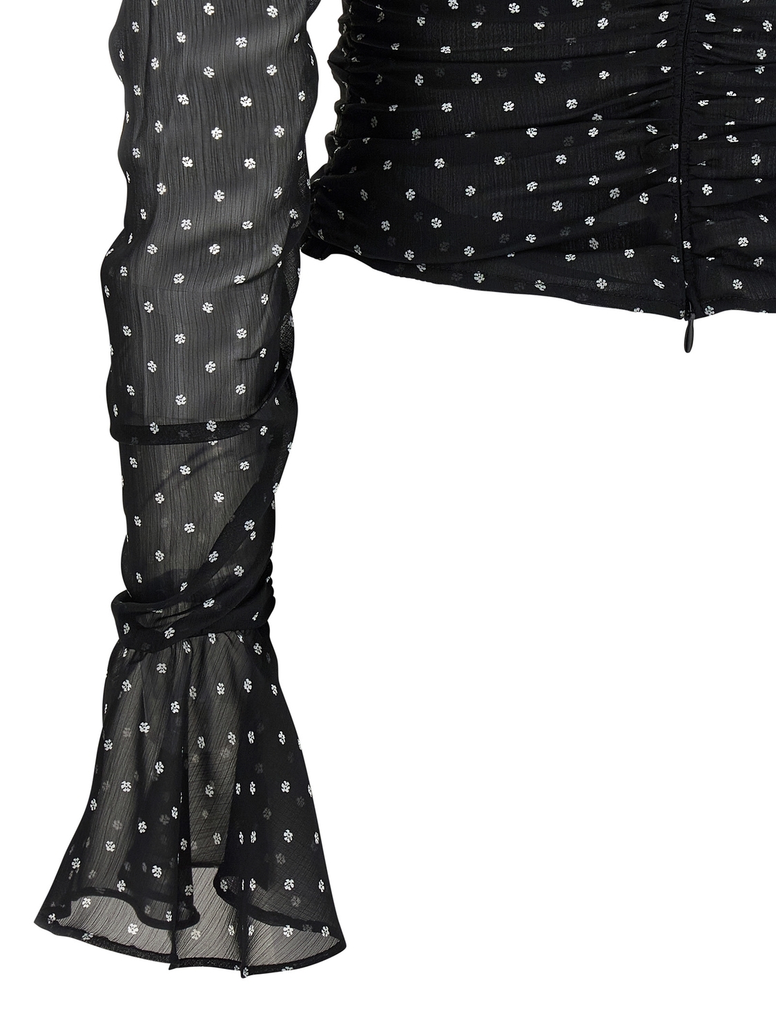 Блузка из шифона с драпировкой из полупрозрачной ткани с эффектом шелка и микрорисунком в цветочек, с круглым вырезом, драпировкой спереди и сзади, застежкой-молнией на спине, длинными рукавами с воланами на манжетах.