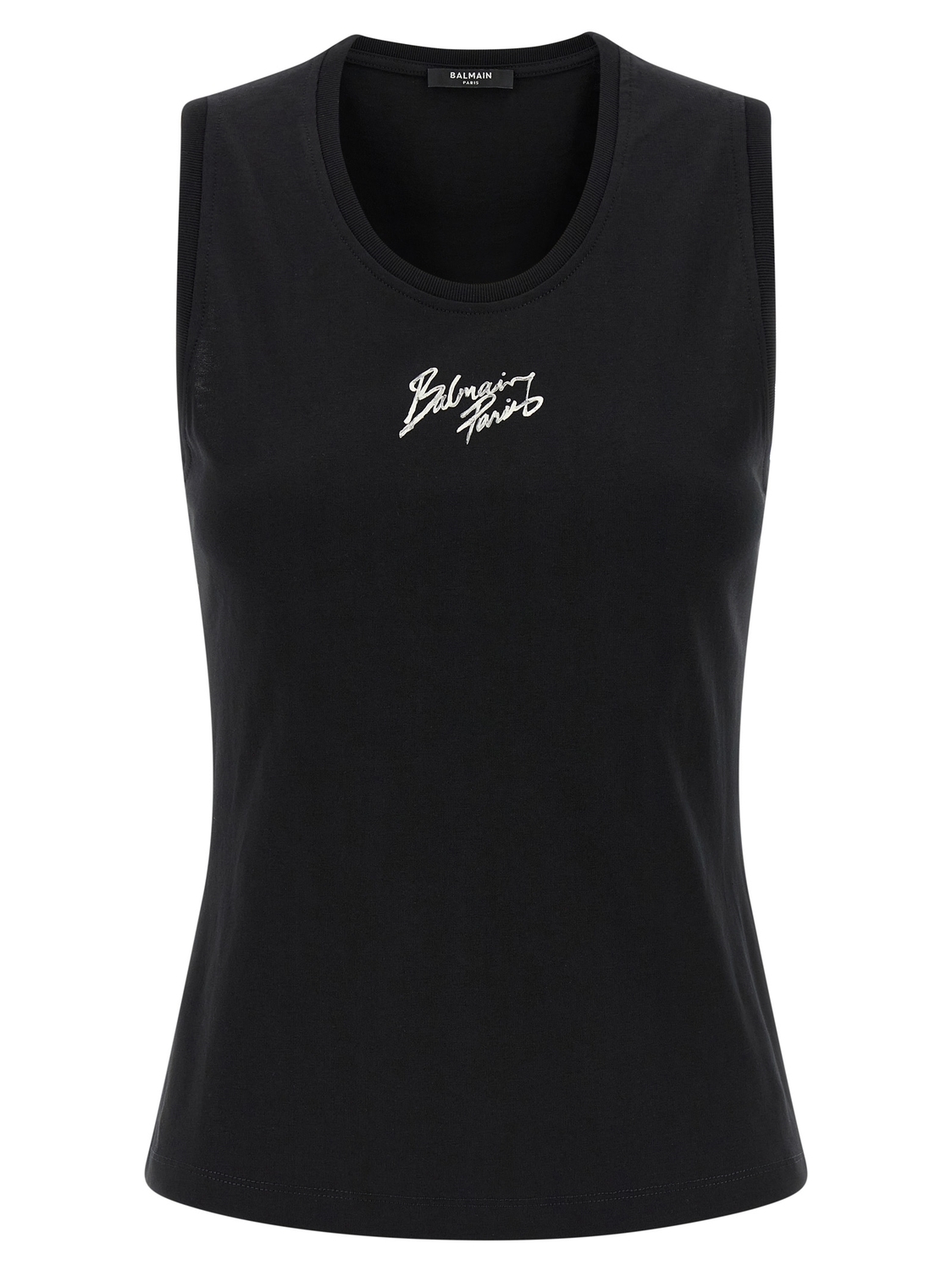 Хлопковый топ с круглым вырезом, принтом "Balmain Paris" спереди, без рукавов.