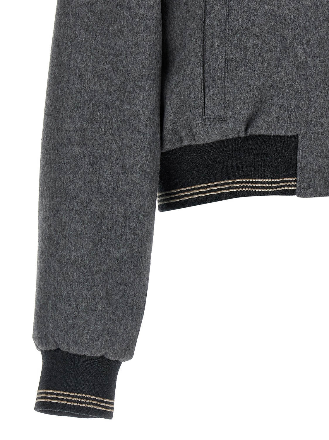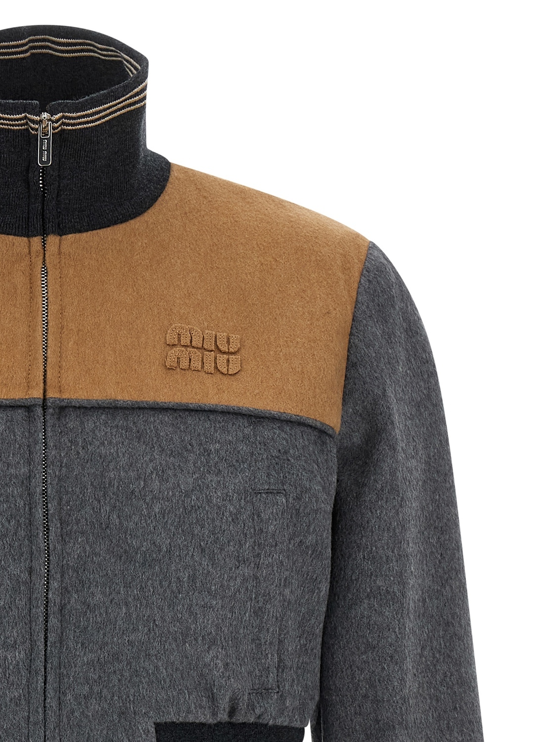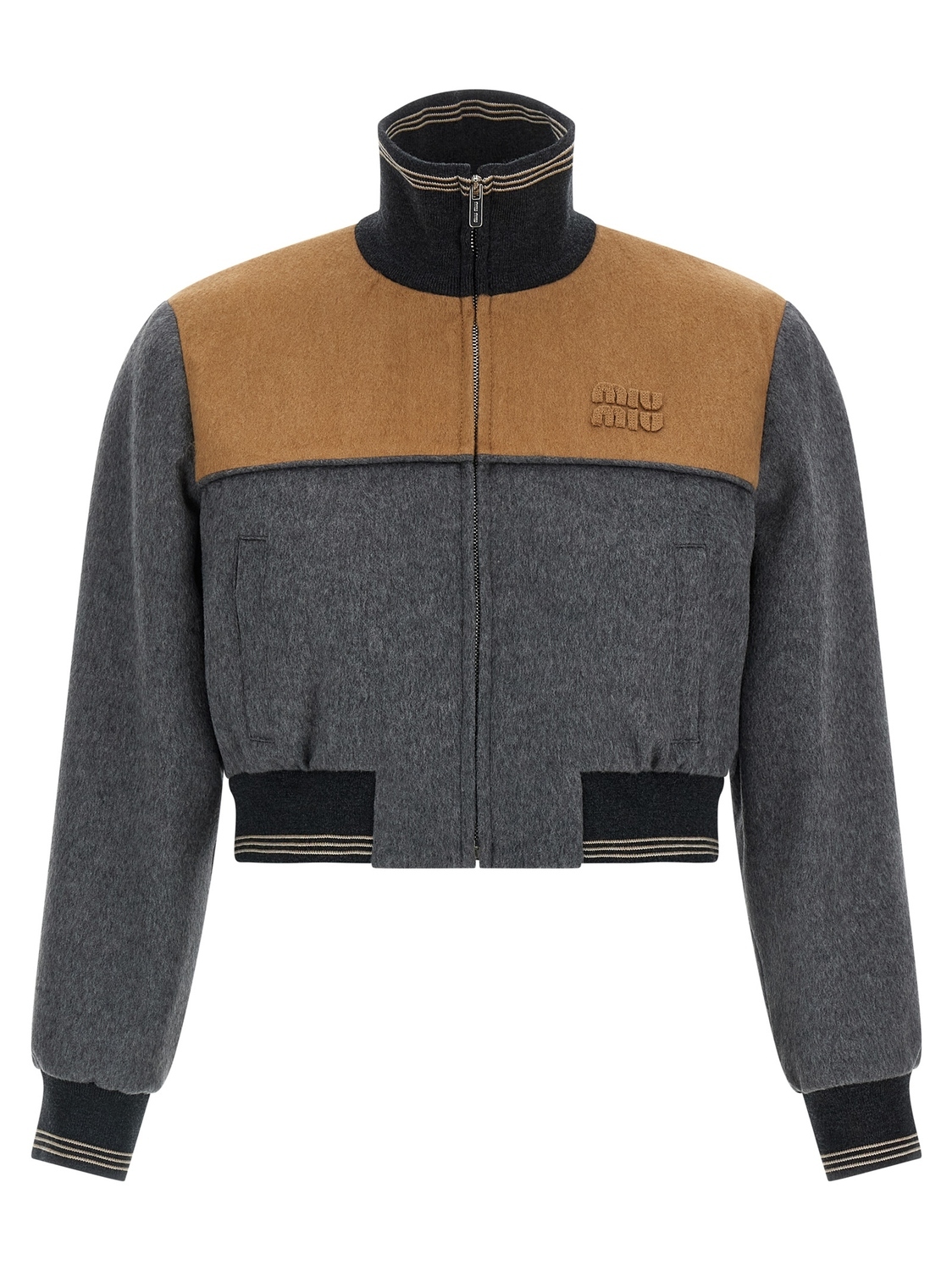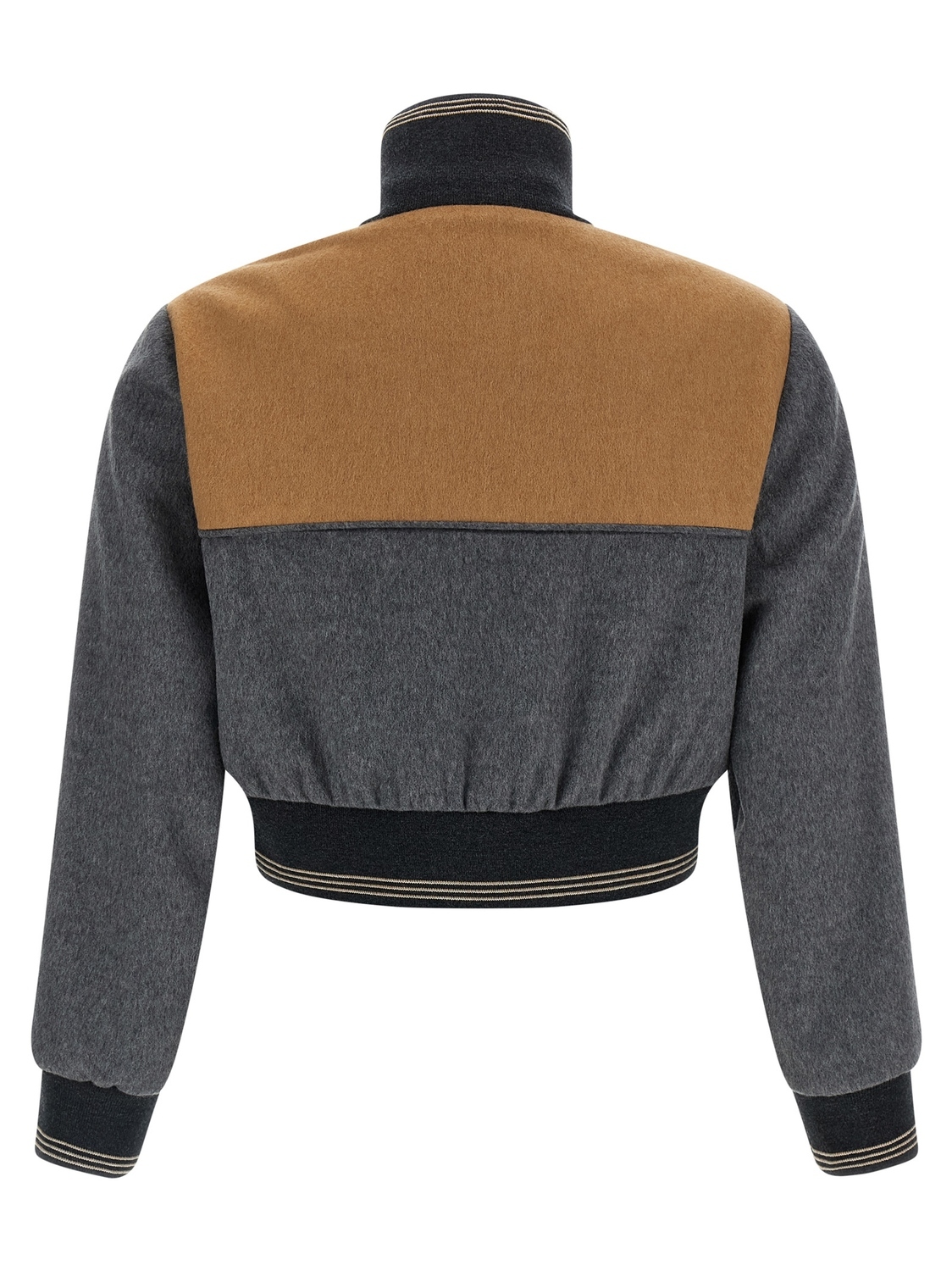 Двухцветная бомбер-куртка из шерсти с кашемиром укороченного кроя с высоким воротником из ребристого трикотажа, застежкой-молнией спереди, нашивкой-логотипом в тон на груди, карманами, длинными рукавами, эластичными манжетами и низом из ребристого трикотажа.
