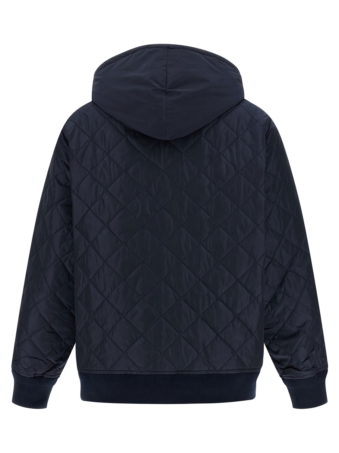 Стеганая нейлоновая куртка, съемный капюшон, передние карманы, застежка-молния, манжеты и низ из трикотажа в рубчик, металлический эмалированный треугольный логотип спереди.