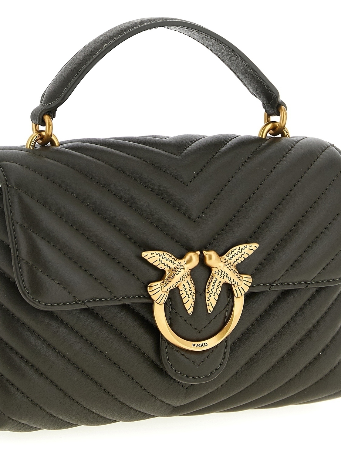 Мини-сумка Lady Love Puff из стеганой наппа-кожи с узором «елочка», с магнитным клапаном и культовой металлической пряжкой «Love Birds Diamond Cut», фиксированной ручкой, подкладкой из микрофибровой замши, цепочкой-ремнем на плечо и съемным плечевым ремнем из наппа-кожи.