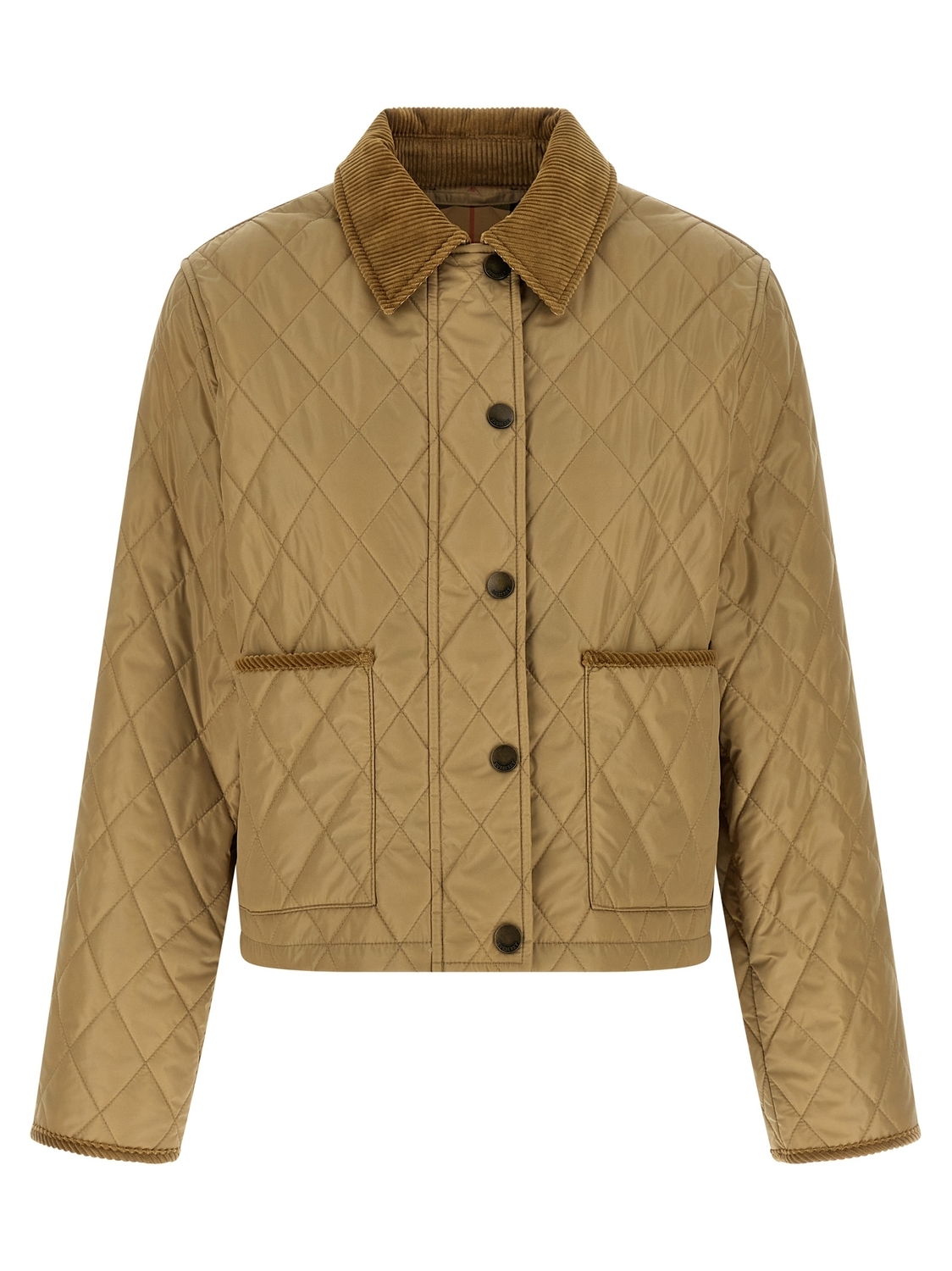 Легкая стеганая нейлоновая куртка 'Tal', контрастная подкладка из хлопкового твила с клеткой Burberry, укороченный воротник-рубашка и отделка в тон из вельвета, застежка на молнии и кнопках спереди, карманы, длинные рукава.