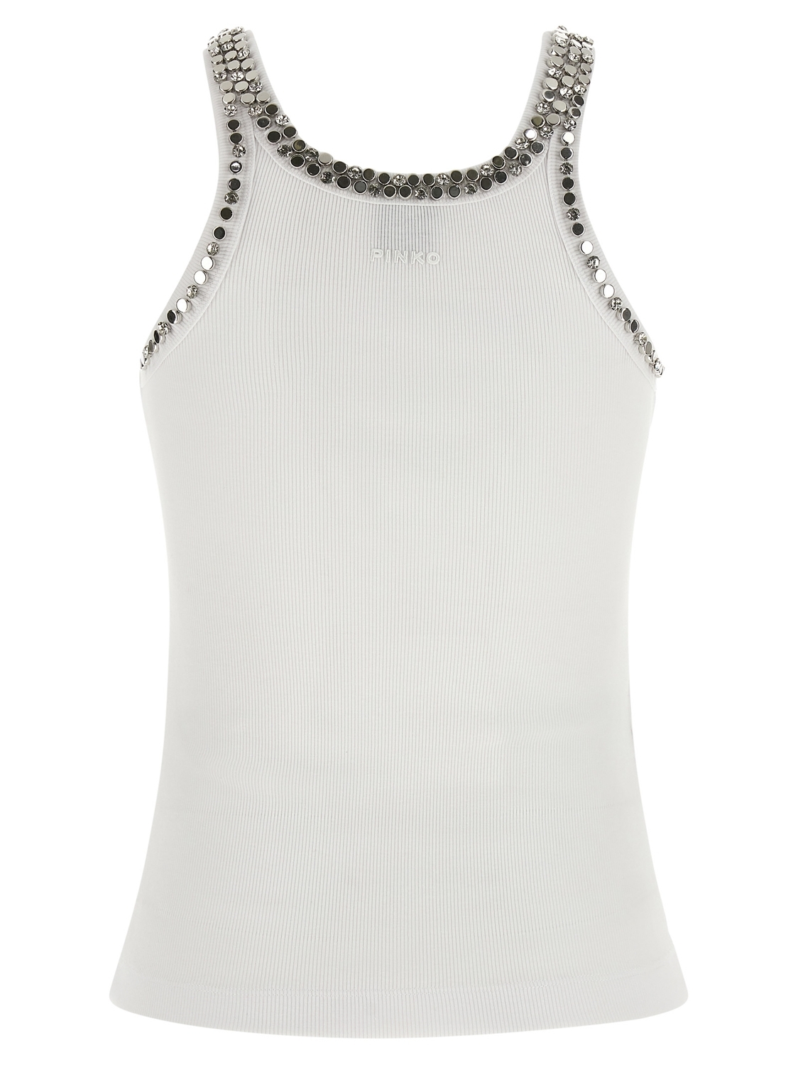 Майка 'Coriandoli' из ребристого эластичного смесового хлопка с металлическими заклепками и кристаллами спереди и сзади, круглый вырез, вышивка логотипа в тон на спине.